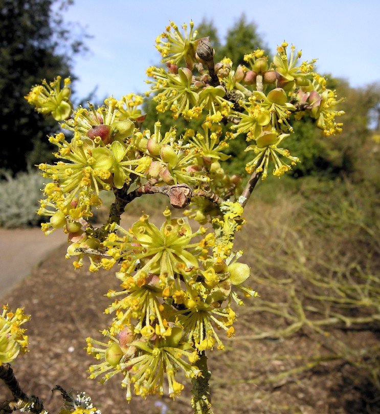 Hartriegel (Cornus) - Bäume und Sträucher, Blüten gelb, in großen Dolden, Hüllblätter fehlend oder klein