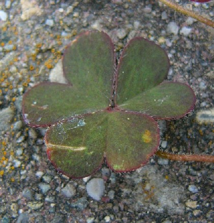 Blätter dreizählig, graugrün Stängel aus Achsen der Grundblätter entspringend, kürzer als Laubblätter, mit angedrückten Haaren und wenigen Drüsen