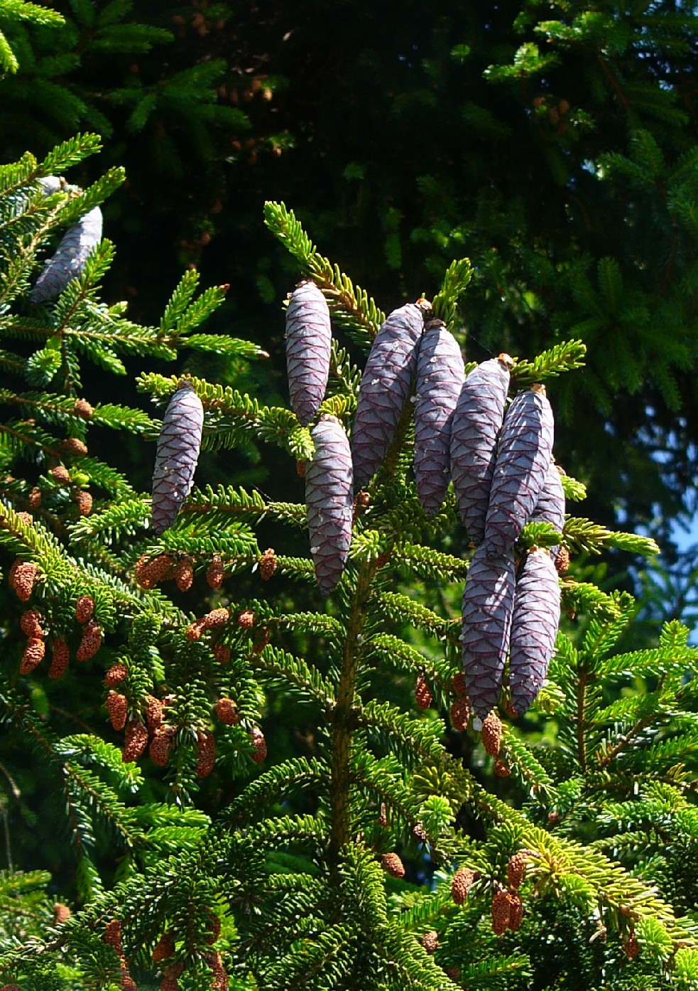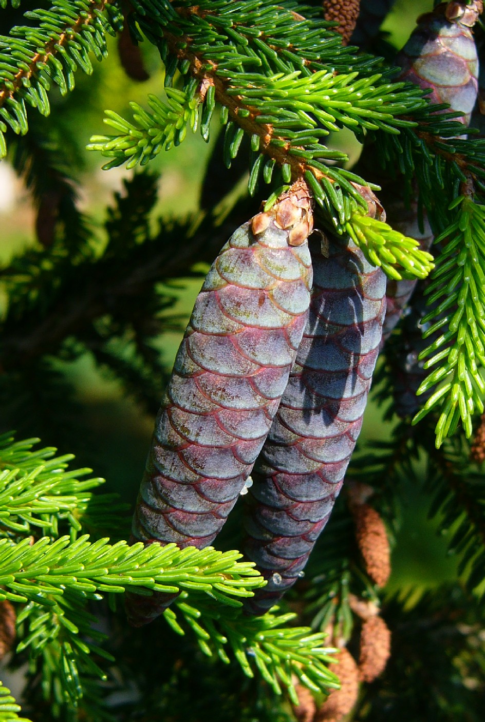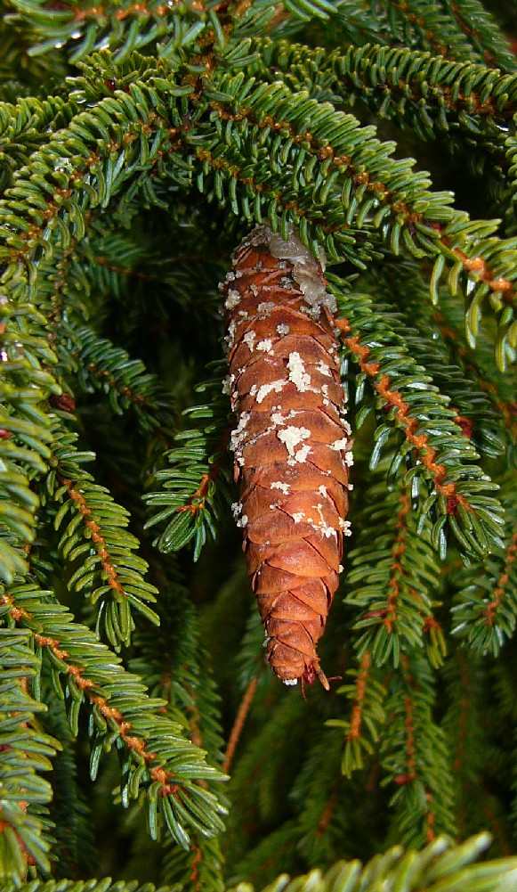 Zapfen 5 - 9 cm lang, hängend, stark harzig, länglich,