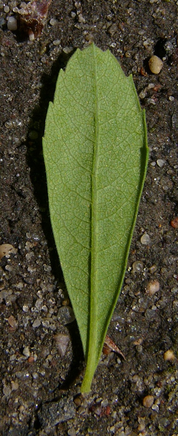 Blätter mit keilförmiger Basis, im oberen Teil gezähnt Blattunterseite blassgrün, anfangs flaumig behaart, später ledrig