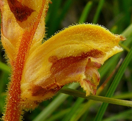 blass- oder braungelb, mit schuppenförmigen Blättern, ohne Chlorophyll