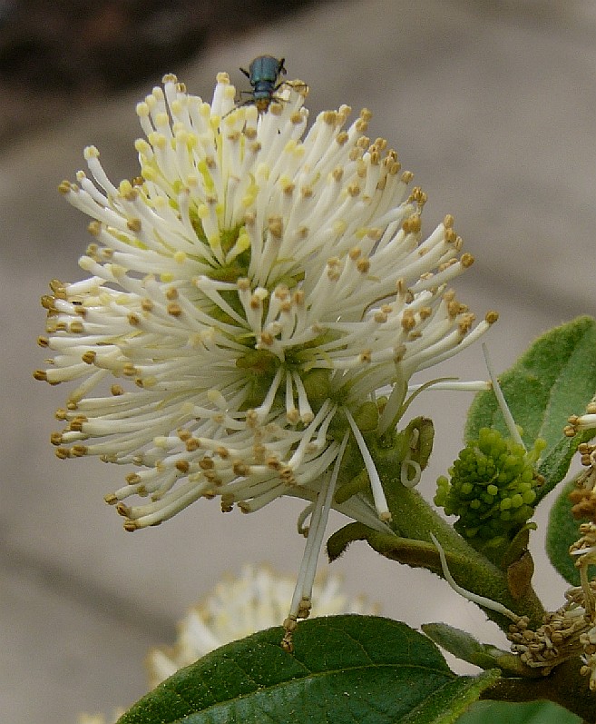 Sommergrüne 1 - 3 m hohe Sträucher Blüten zwittrig, dicht in 2 - 3 cm langen Köpfchen stehend Unter den auffälligen Staubblättern befindet sich der Fruchtknoten mit 2 grünlichen Griffeln Früchte = 2- samige, 2- klappige Kapseln