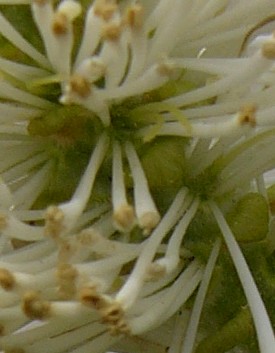 Blüten zwittrig, dicht in 2 - 3 cm langen Köpfchen stehend Einzelblüte mit 5 - 7- lappigen Kelch, mit ca. 24 nach oben verdickten Staubblättern und gelben Staubbeuteln > 1 |