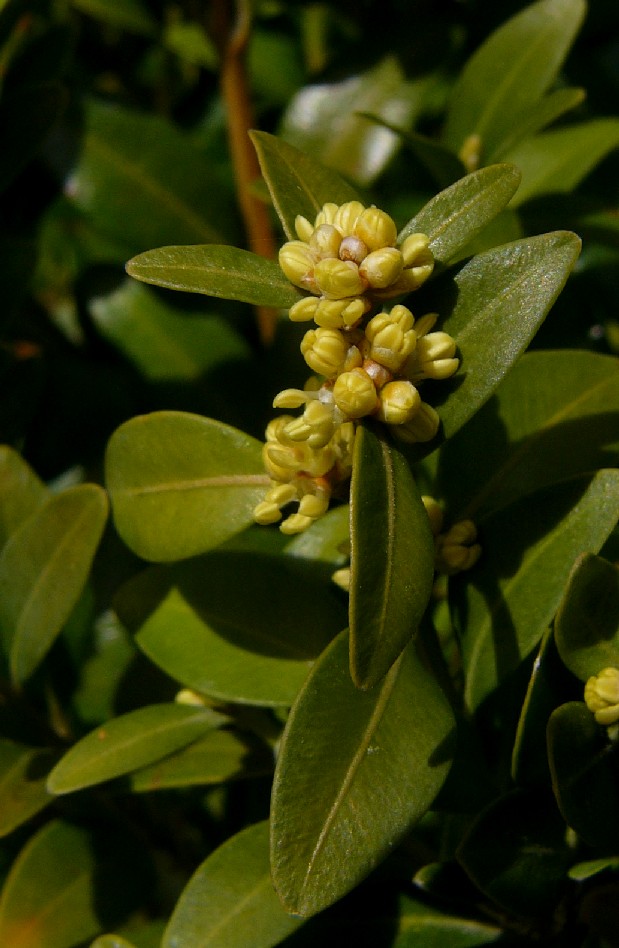 Pflanze 30 - 300 cm groß Blüten klein, in blattachselständigen Knäueln, in einem Knäuel befinden sich viele männliche und einige weibliche Blüten (d.h. Pflanze ist einhäusig), alle Blüten haben nur 4 Kelchblätter, Kronblätter fehlen Männliche Blüten mit 4 - 6 Staubblättern, Frucht eine runzelige, braune Kapsel. Blätter eiförmig, ledrig, immergrün, gegenständig Blätter 1 - 2,5 cm
