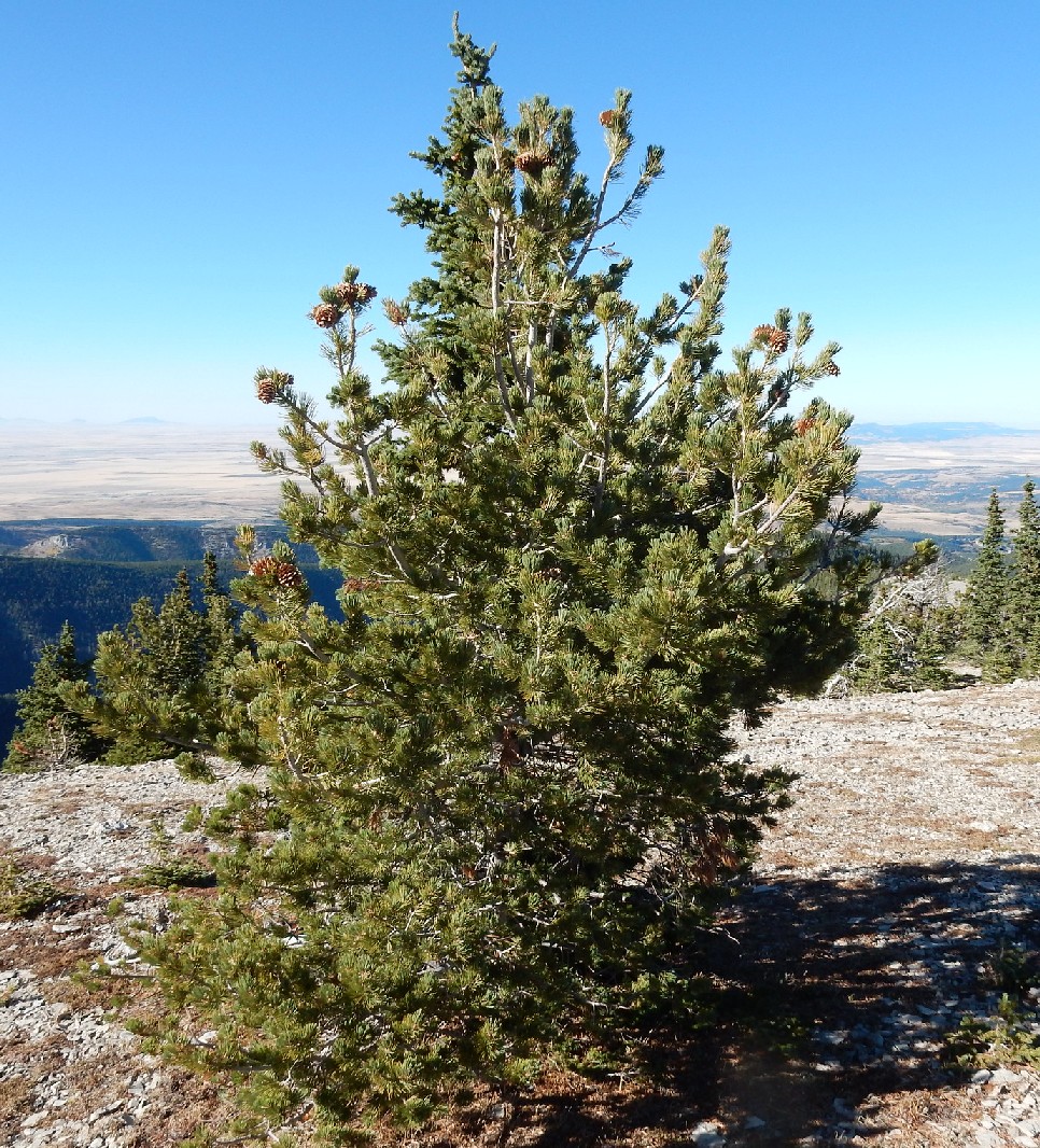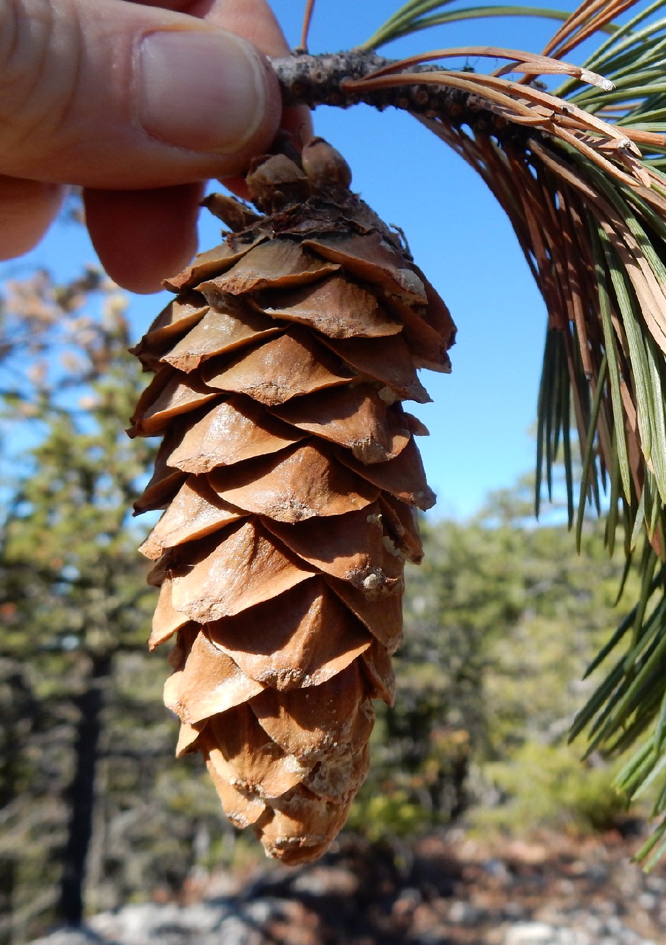 der Nadeln fein behaart, Zapfen zylindrisch, bis 2 cm lang gestielt, 8 - 20 (25) cm lang, Schuppen der reifen Zapfen an der Spitze nicht einwärts gebogen > 3