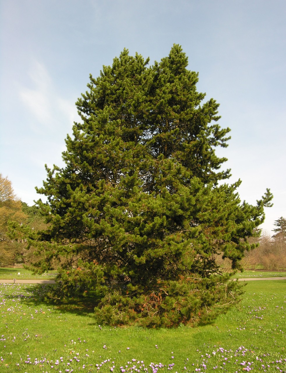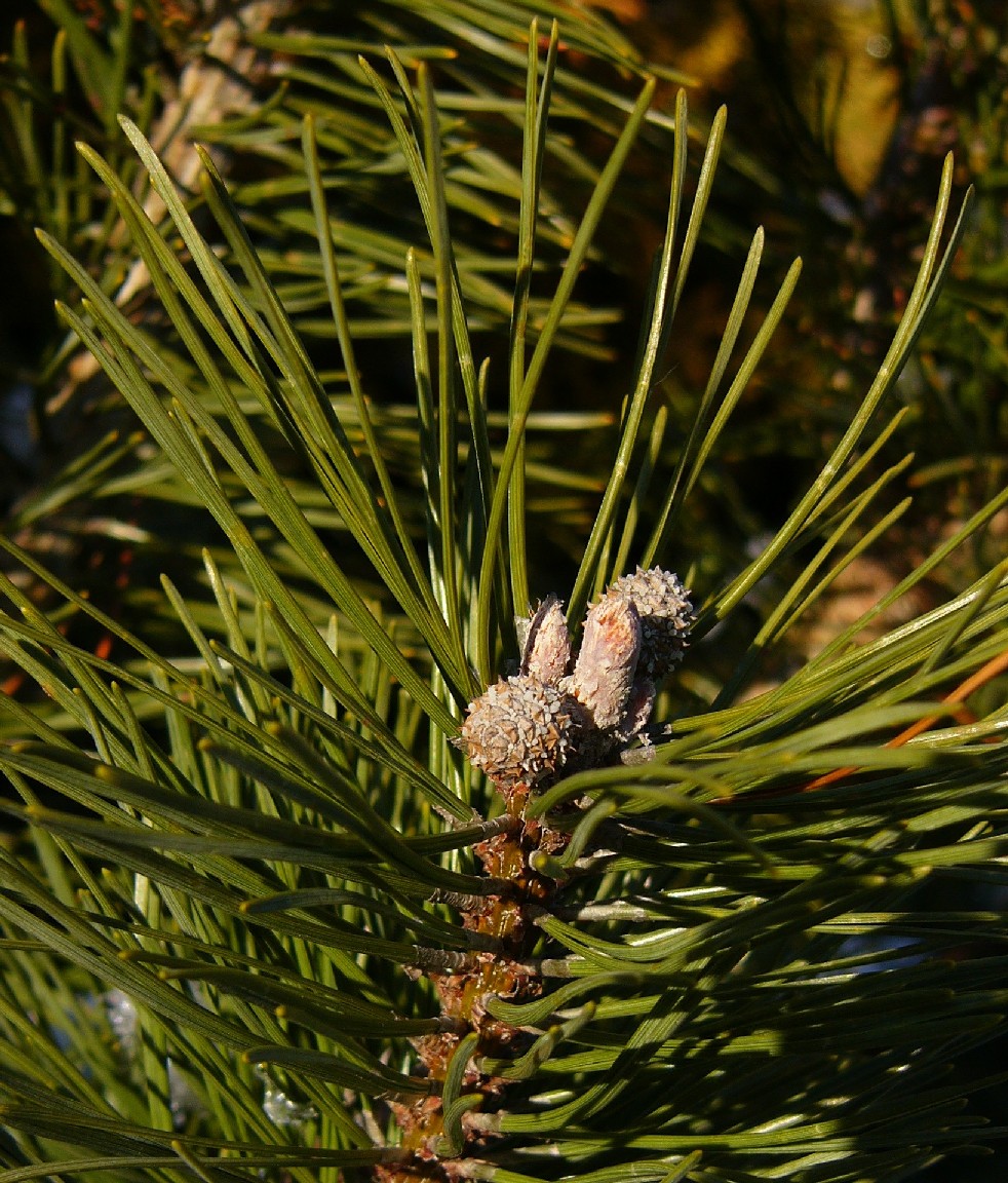 Nadeln zu zweit, 4 - 8 cm lang, gedreht, wenig stechend, sehr fein gezähnt, Spaltöffnungsbänder unauffällig, Nadelscheiden 4- 6 mm lang, bleibend