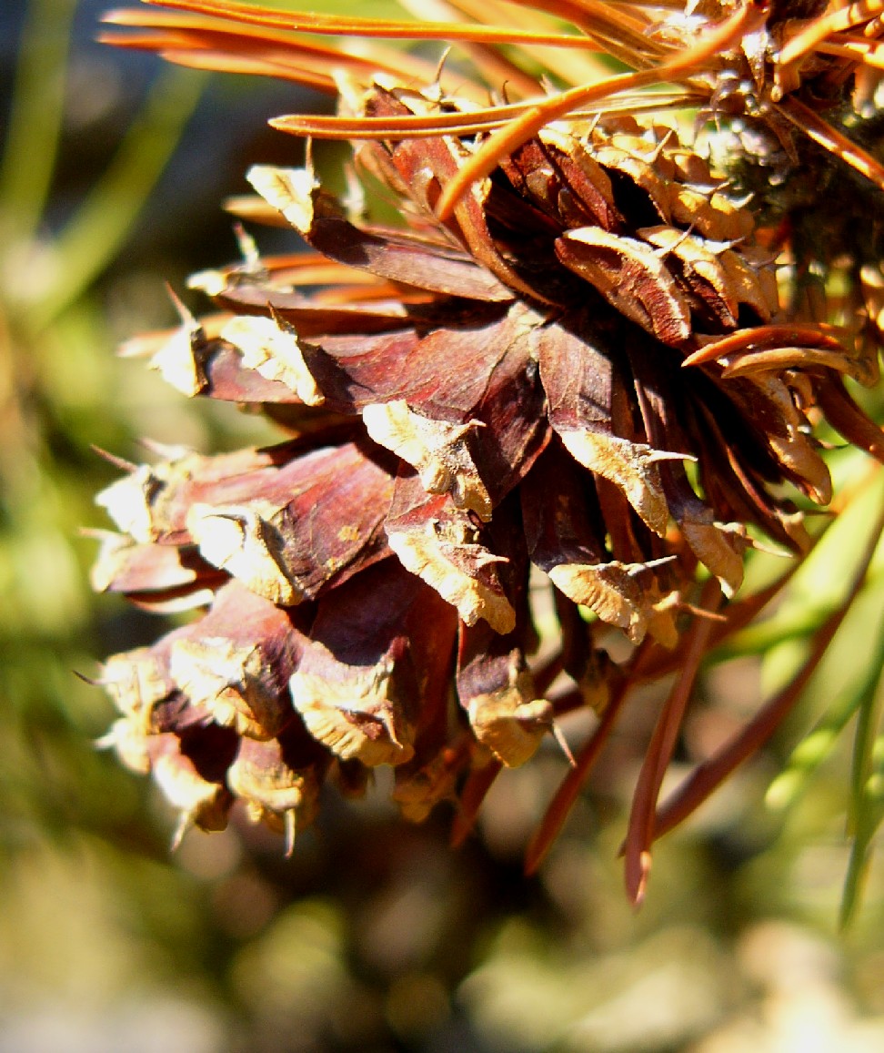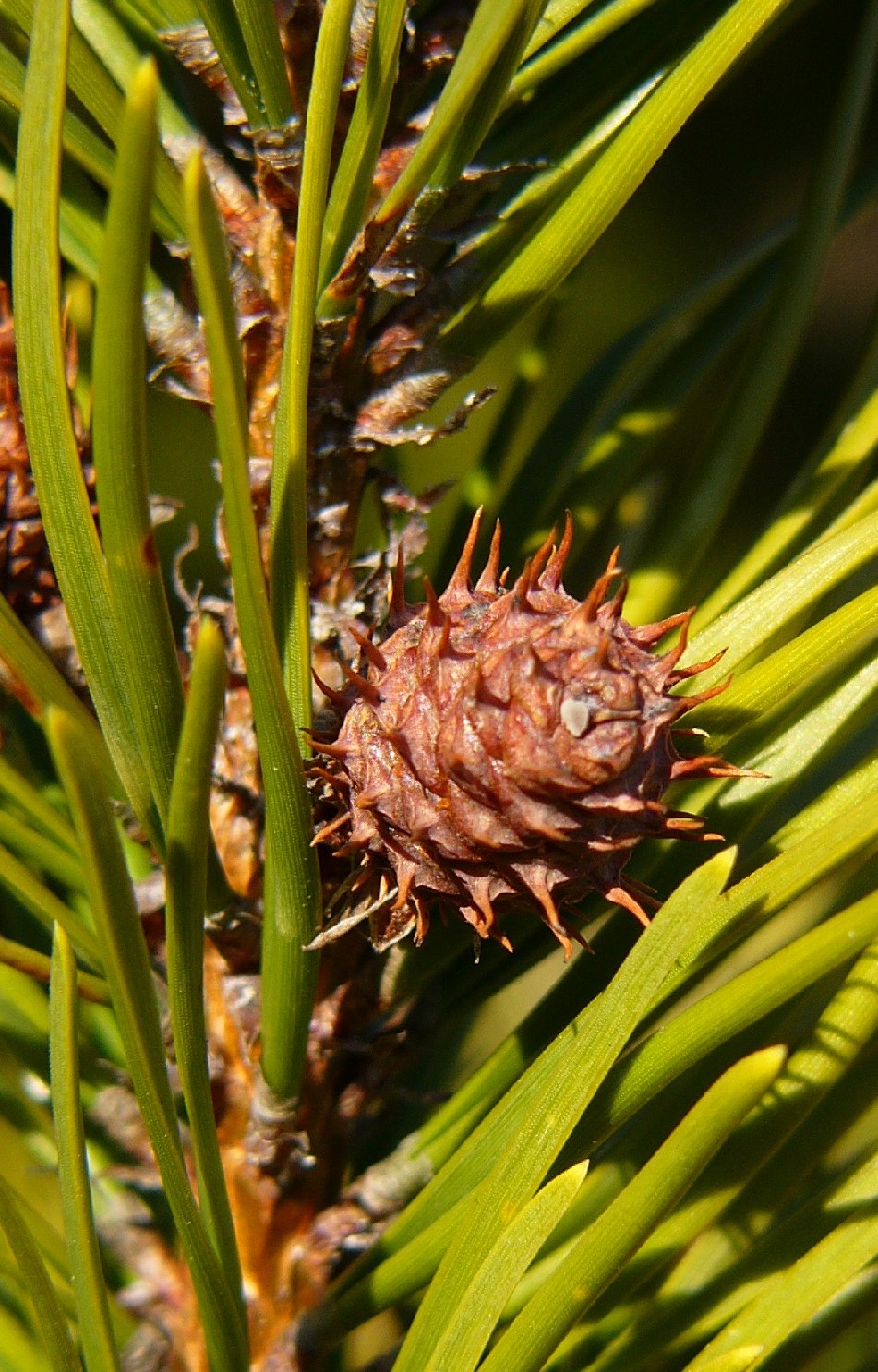 Kiefer - Nadeln vorwiegend zu 2, höchstens 7 cm lang, Zapfenschuppen mit langem Dorn