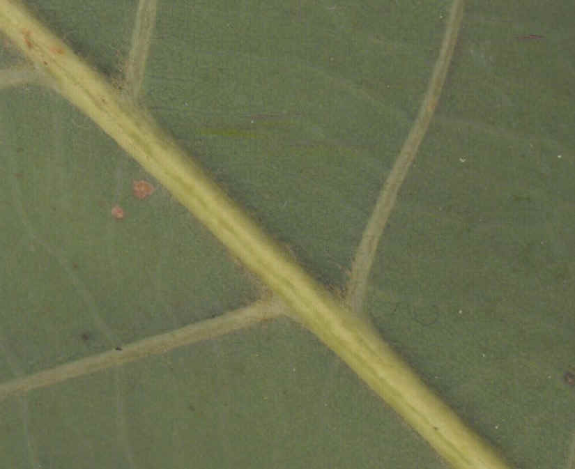 Blattunterseite und Blattstiel dicht mit mit Sternhaaren besetzt, junge Triebe flaumig behaart