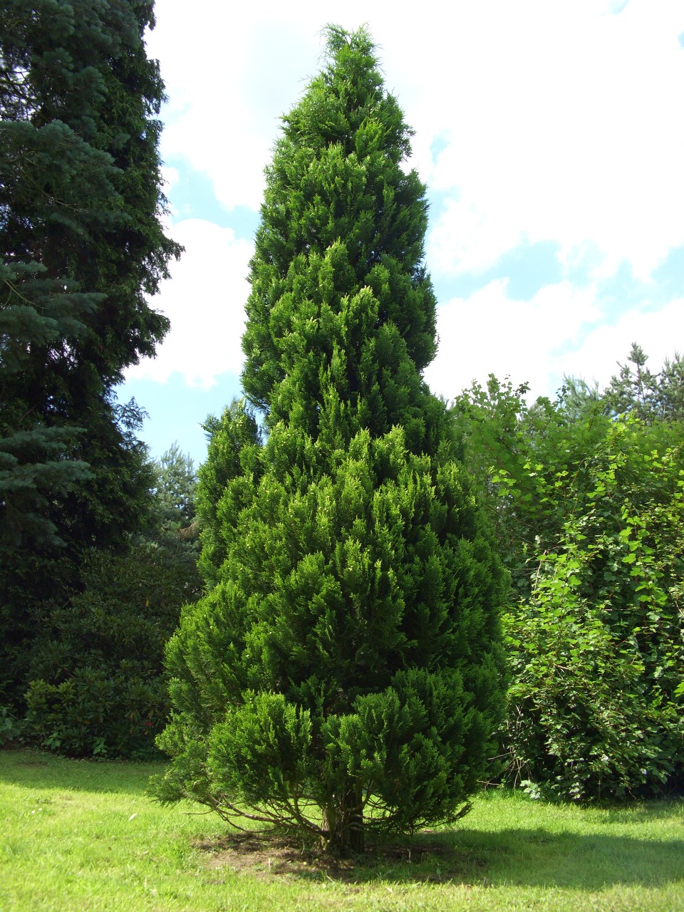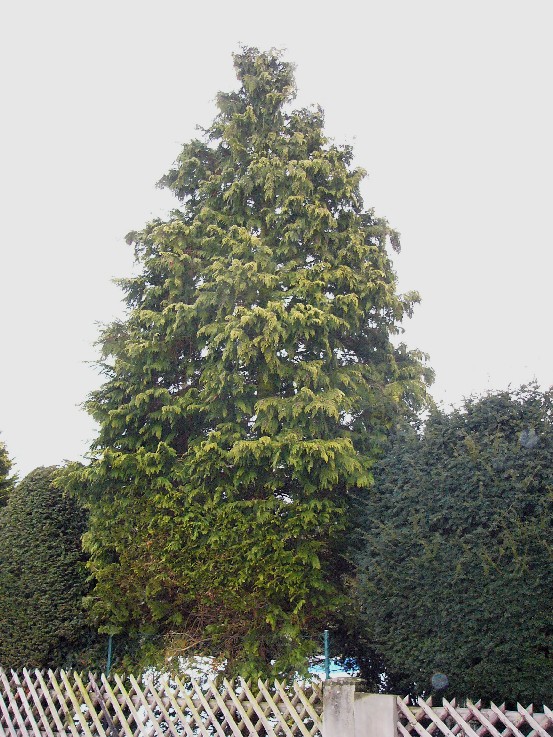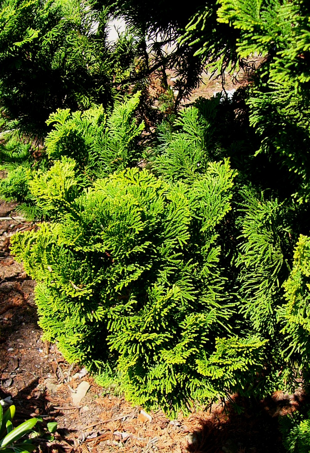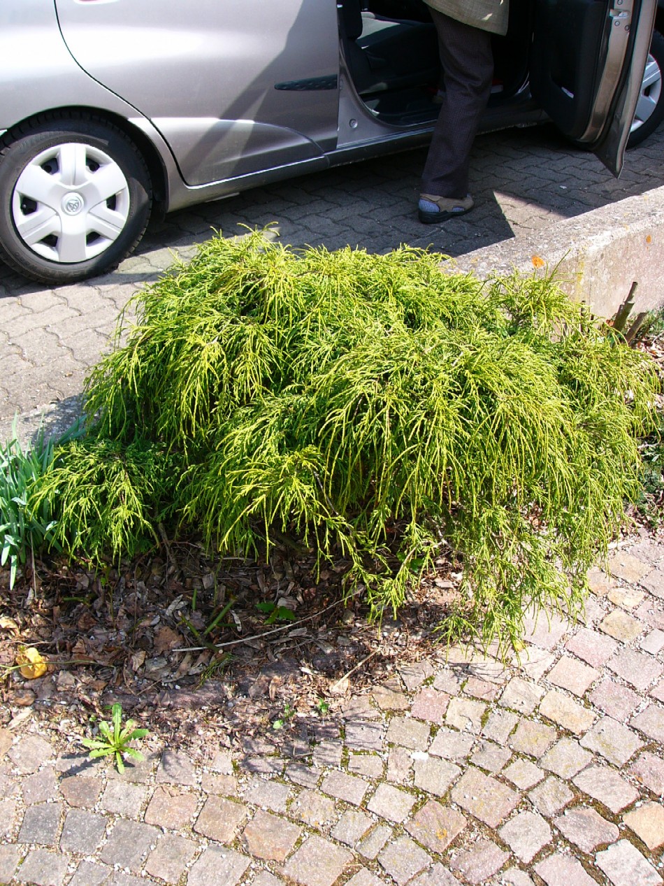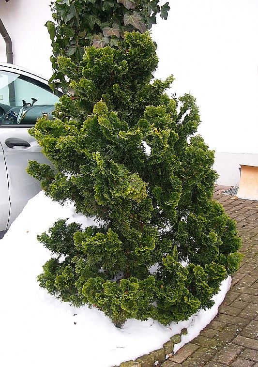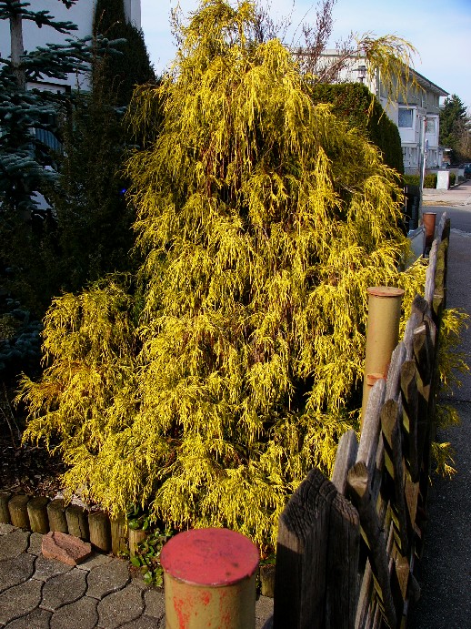 in Deutschland: Herkunft: Von Chamaecyparis obtusa werden überwiegend die Sorten 'Gracilis' und 'Nana Gracilis' gepflanzt, welche muschelförmig gedrehte Zweige besitzen. Die Wildform hat ausgebreitete Zweige. Großes Exemplar von 'Gracilis Aurea'