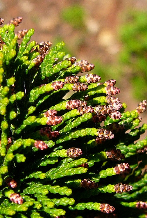 Kantenblätter abstehend, spitz Männliche Pollensäcke gelblich Schuppenblätter der Wildsorte mit weißen Dreiecken auf der Unterseite > 1
