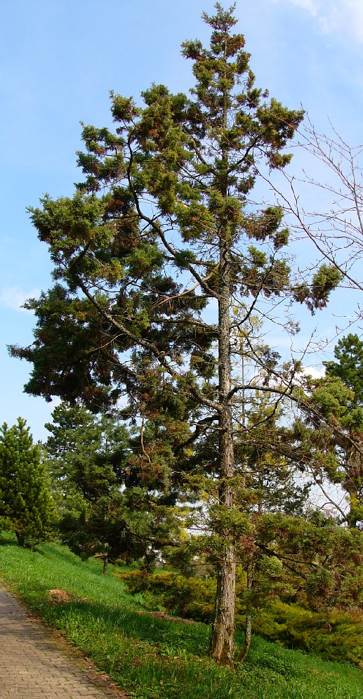 20 - 30 m hoher Baum Gipfeltrieb meist überhängend Pflanze einhäusig: Männliche Pollensäcke karminrot Weibliche Blüten bläulich, ca. 5 mm lang Weibliche Zapfen 8 - 10 mm im Durchmesser, Samen geflügelt