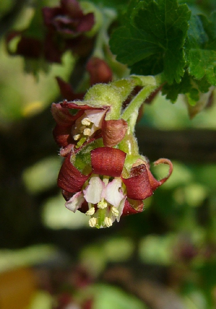 innen rotbraun außen grün Kelchzipfel lang, ausgebreitet oder umgerollt Kelchröhre glockig, Kronblätter weiß > Josta- Beere |