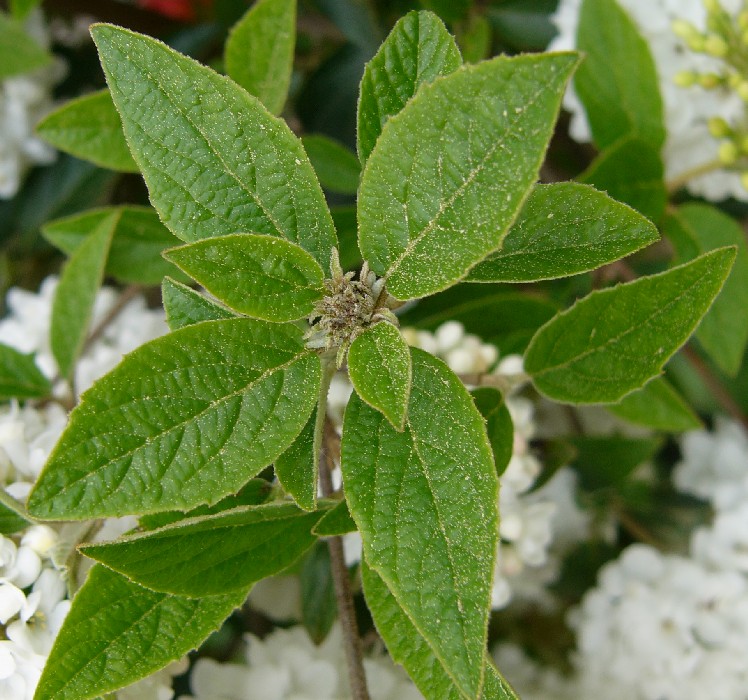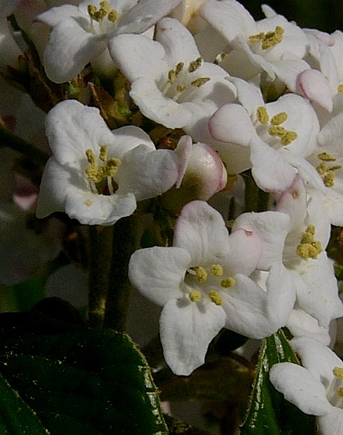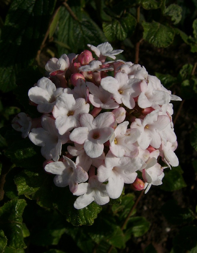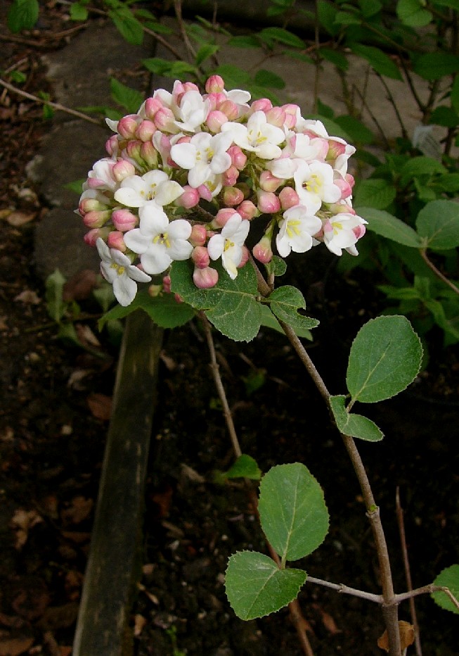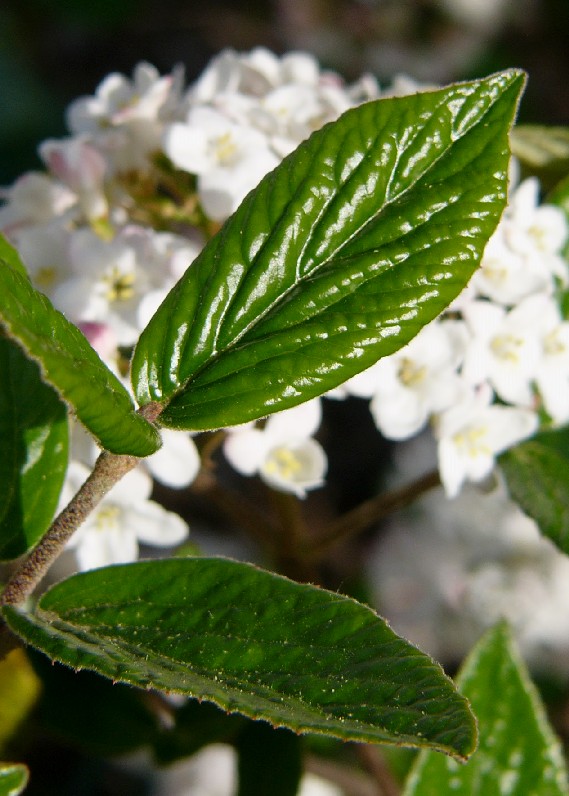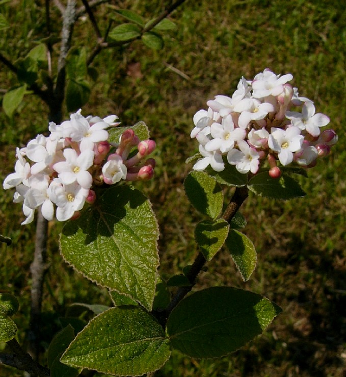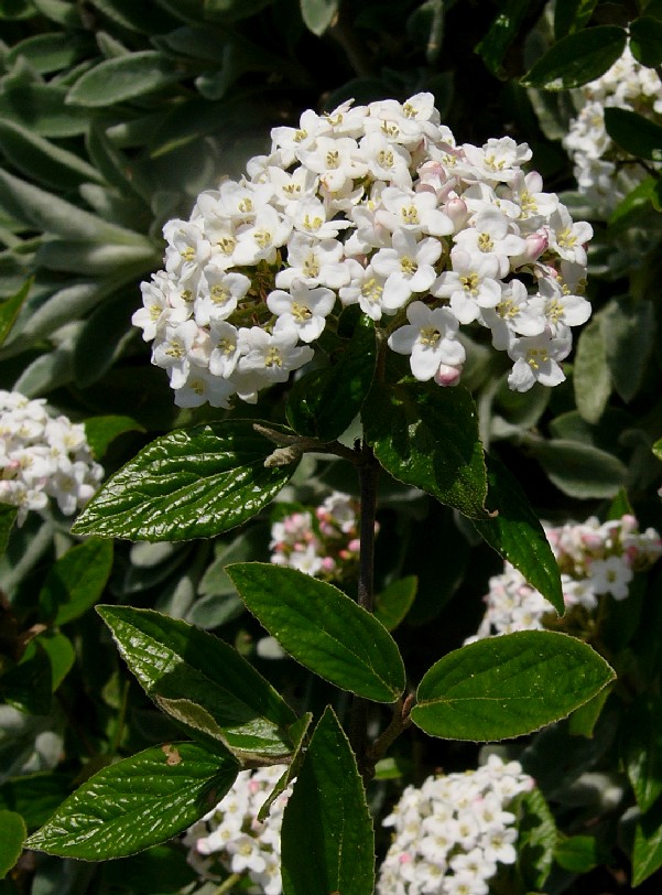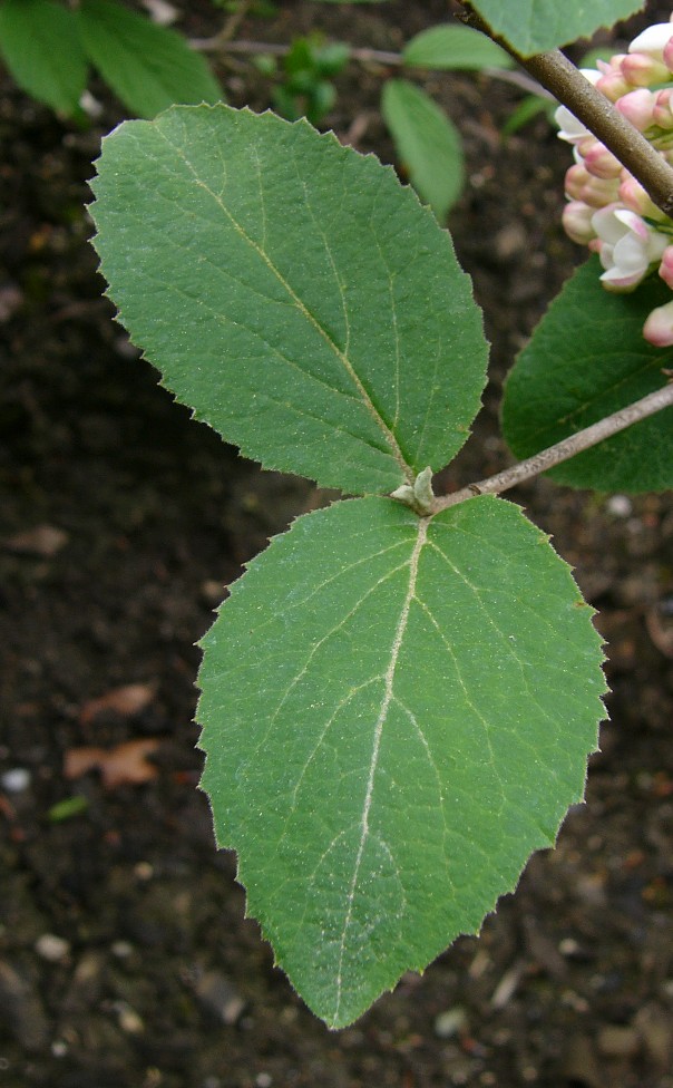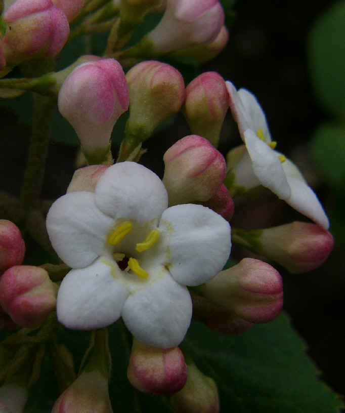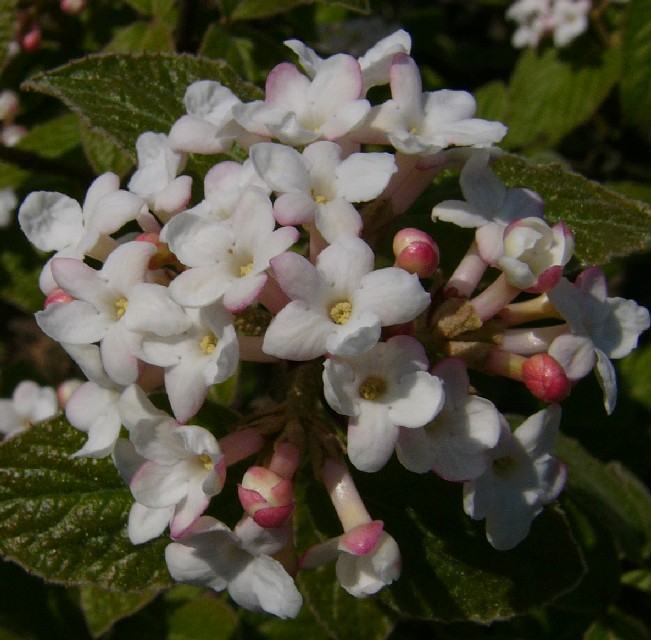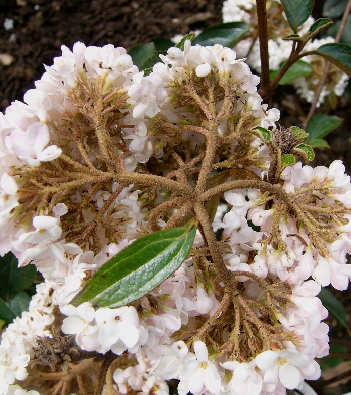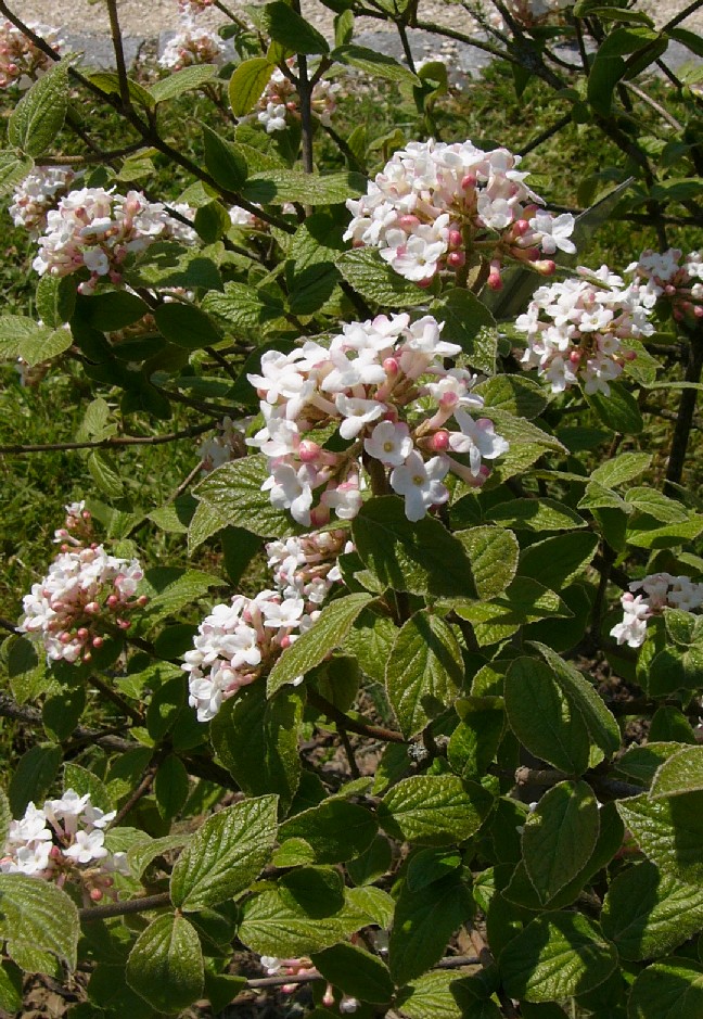 2 - 3 m hoher Strauch, wintergrün Blütenstände halbkugelig Blüten anfangs rosa, stark duftend Blätter 6 - 9 cm lang, breit eiförmig, grob gezähnt Blätter unterseits sternhaarig