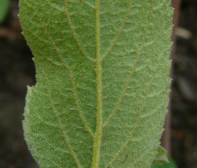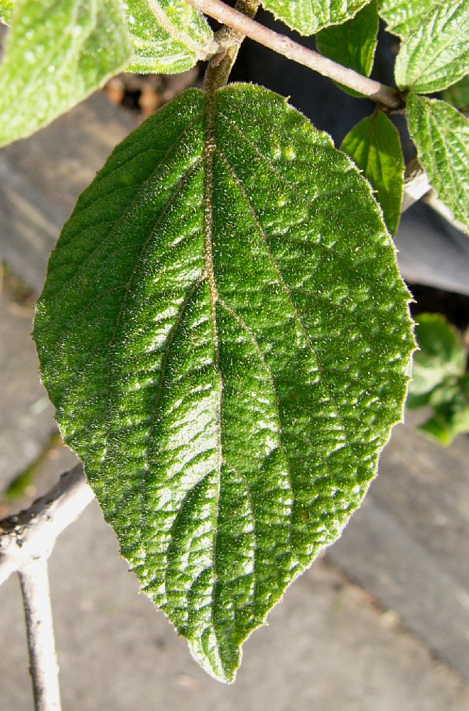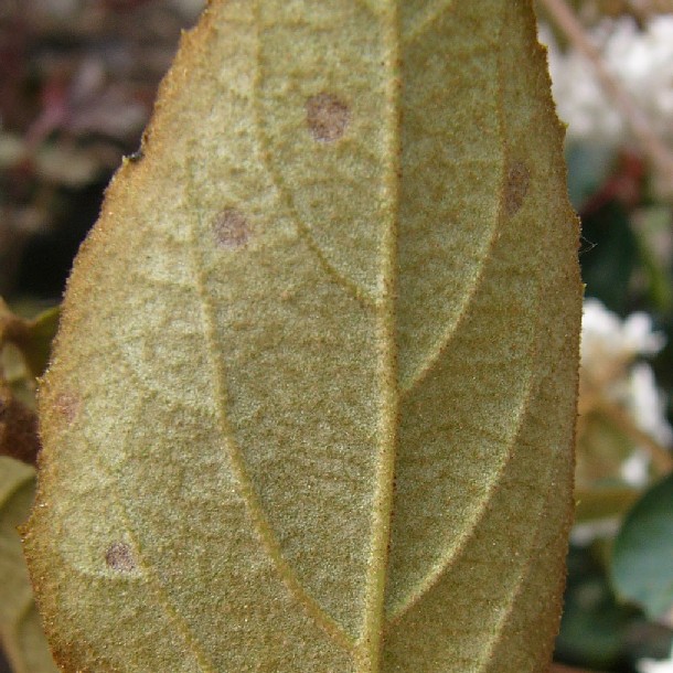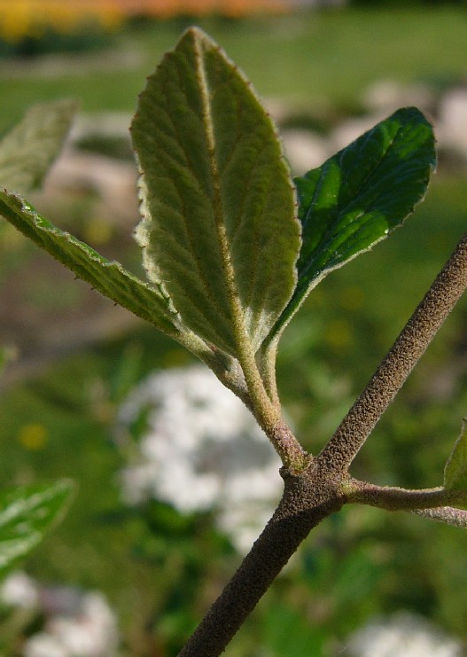 Blätter 8 - 10 cm lang, etwas ledrig Blätter elliptisch, schwach gezähnelt Blätter unterseits dicht sternhaarig graufilzig