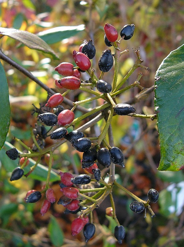1 - 3 m hoher Strauch, immergrün Blütenstand meist schirmtraubenförmig Blütenknospen rosa Blüten weiß, ohne Griffel, Kronzipfel ausgebreitet Früchte erst rot, später schwarz Blätter 3 - 7 cm lang, dunkelgrün, glänzend, eiförmig, ganzrandig, schwach gezähnelt, oberseits schwach sternhaarig Triebe dicht braun sternfilzig