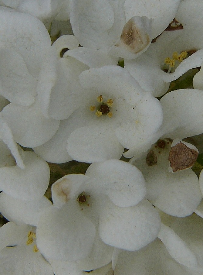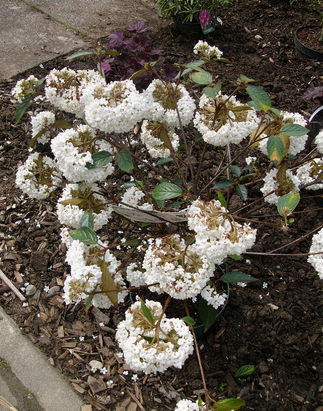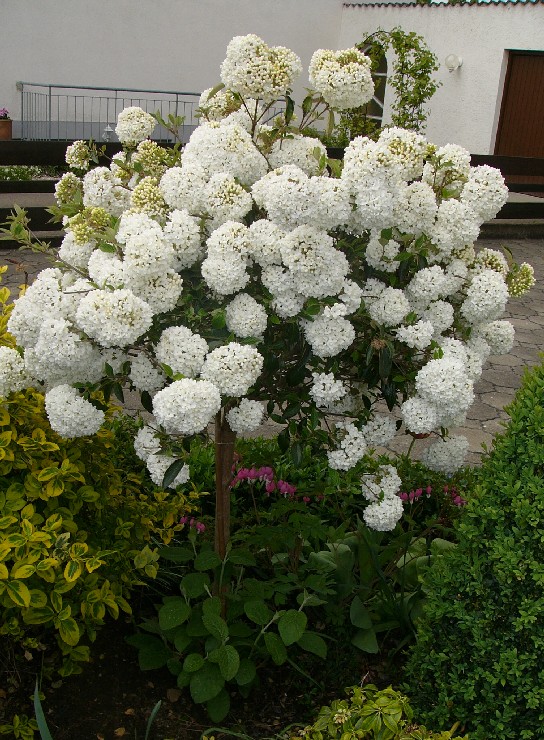 1 - 3 m hoher Strauch, wintergrün, oft auf ein Hochstämmchen gesetzt, auch junge Pflanzen schon reichblühend Blütenstände ballförmig Blütenbälle oft überhängend, wodurch sich von oben die sternhaarigen Blütenstiele gut erkennen Blütenknospen cremefarben oder rosa überhaucht Blüten aufgeblüht rein weiß, ohne Griffel, Staubblätter kürzer als die Kronblätter Früchte kugelig, erst rot, später schwarz