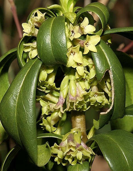 Perigonzipfeln Blätter nicht silbrig glänzend > Daphne (Seidelbast)