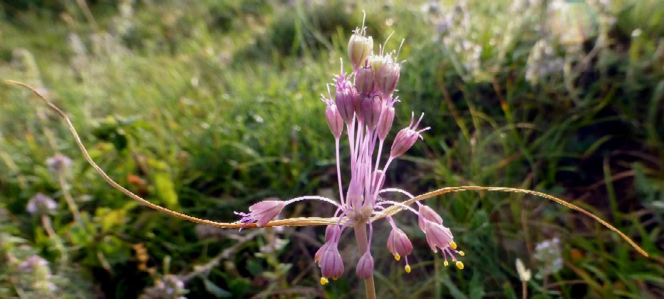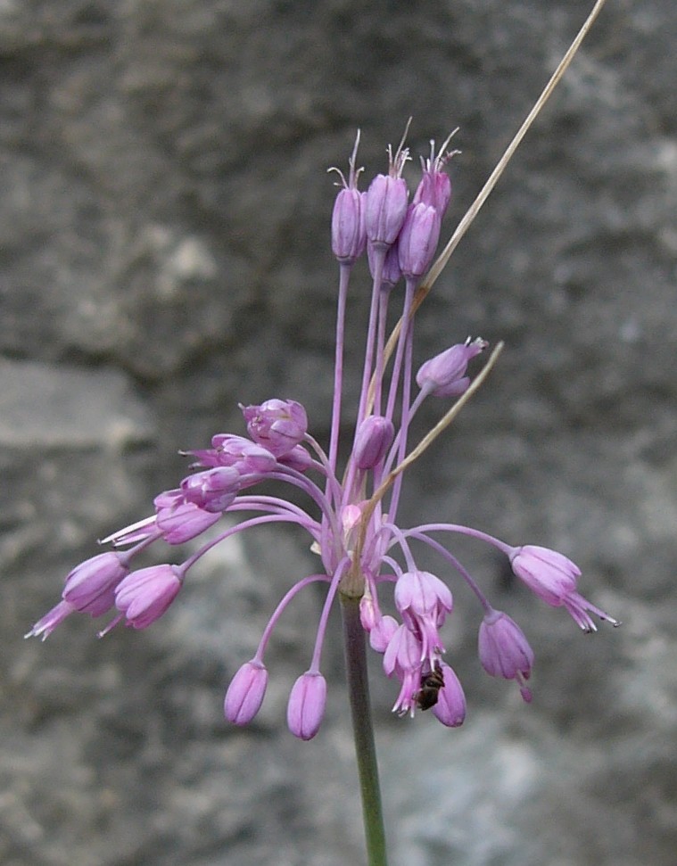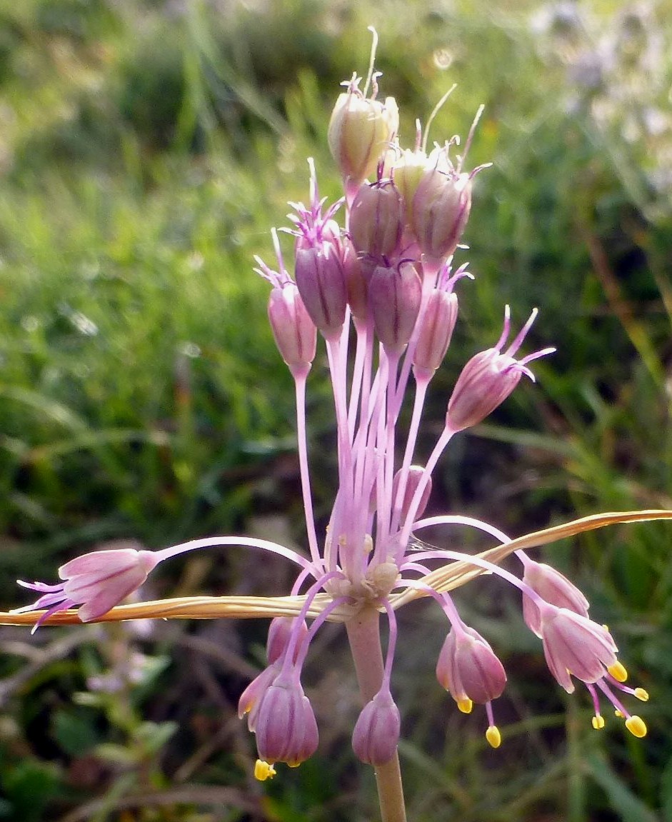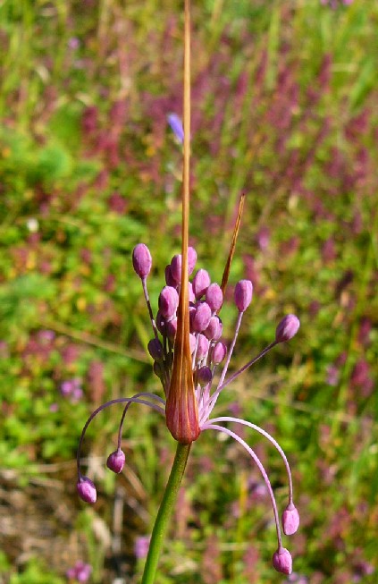Allium - Blütenstand ohne Bulbillen, Blüten rosa in kugeligen vielblütigen Köpfchen, Blütenstiele schlank, nicht aufgeblasen, Blätter 1 - 5 mm breit, Staubblätter länger als die Perigonblätter, innere Staubblätter ohne pfriemliche Fortsätze