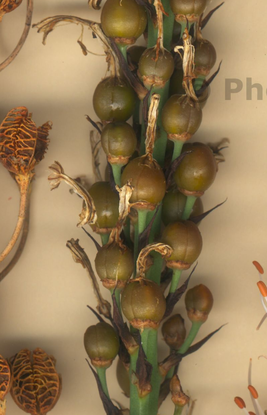 Kapsel rundlich, 9 - 13 mm im Durchmesser, gelbgrün, matt,