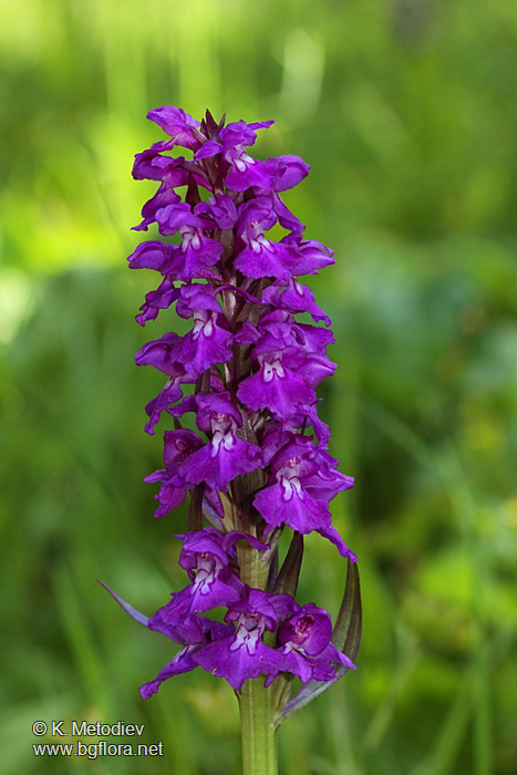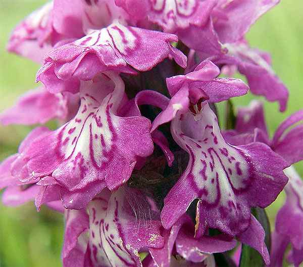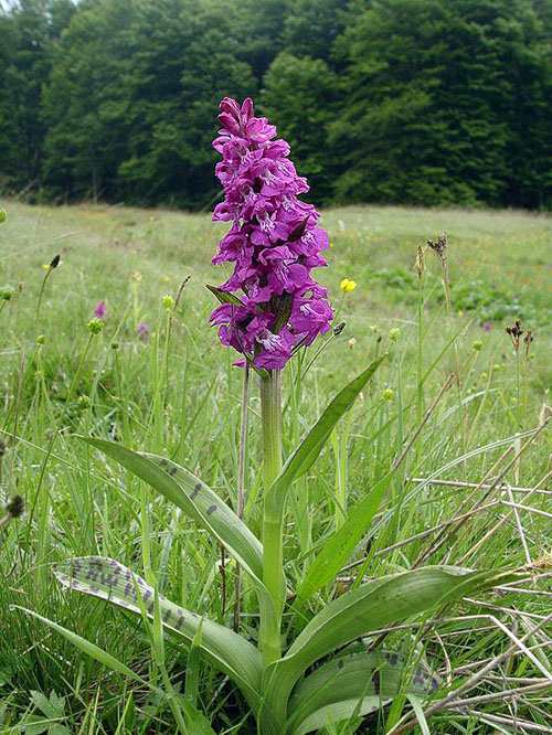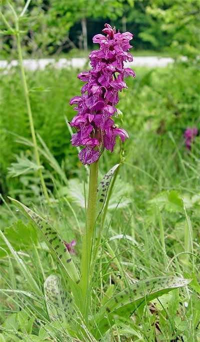 Dactylorhiza - Blüten violett oder rosa, Seitliche Petalen senkrecht abstehend, Blätter breit
