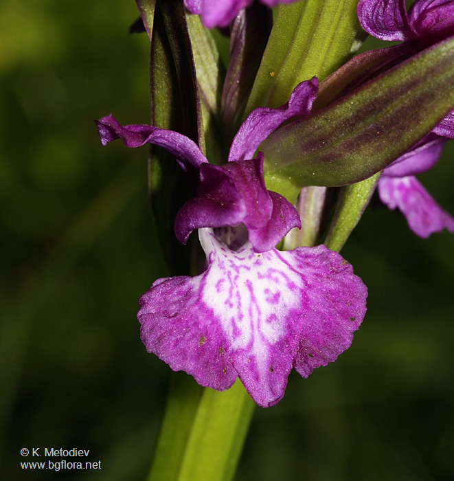 Seitenlappen , Sporn 8 - 14 mm lang, 2 - 3 mm im Durchmesser, 3/4 so lang wie der Fruchtknoten Stängel 3 - 6- blättrig, Spitze des obersten Laubblattes erreicht den Blütenstand Untere Blätter eiförmig, höchstens 4 mal so lang wie breit, meistens gefleckt