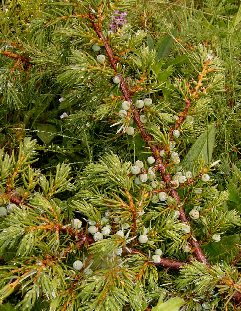 Zapfen beerenartig, aromatisch, von den zugehörigen Nadeln wenig überragt