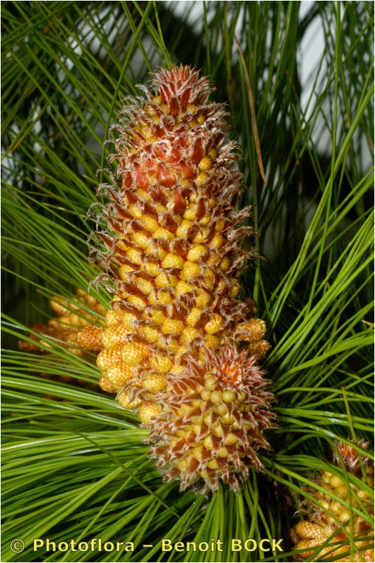 Männliche Zapfen eiförmig, gelblich, beim Vervlühen rötlich