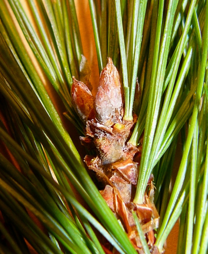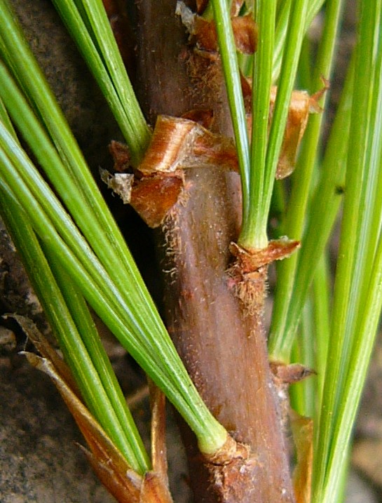 Jungtriebe dünn (bis 3 mm Durchmesser), anfangs unter den Ansatzstellen der Nadeln fein behaart, später verkahlend, Nadelscheiden bald abfallend
