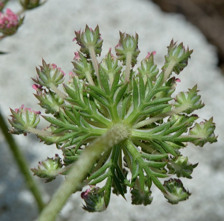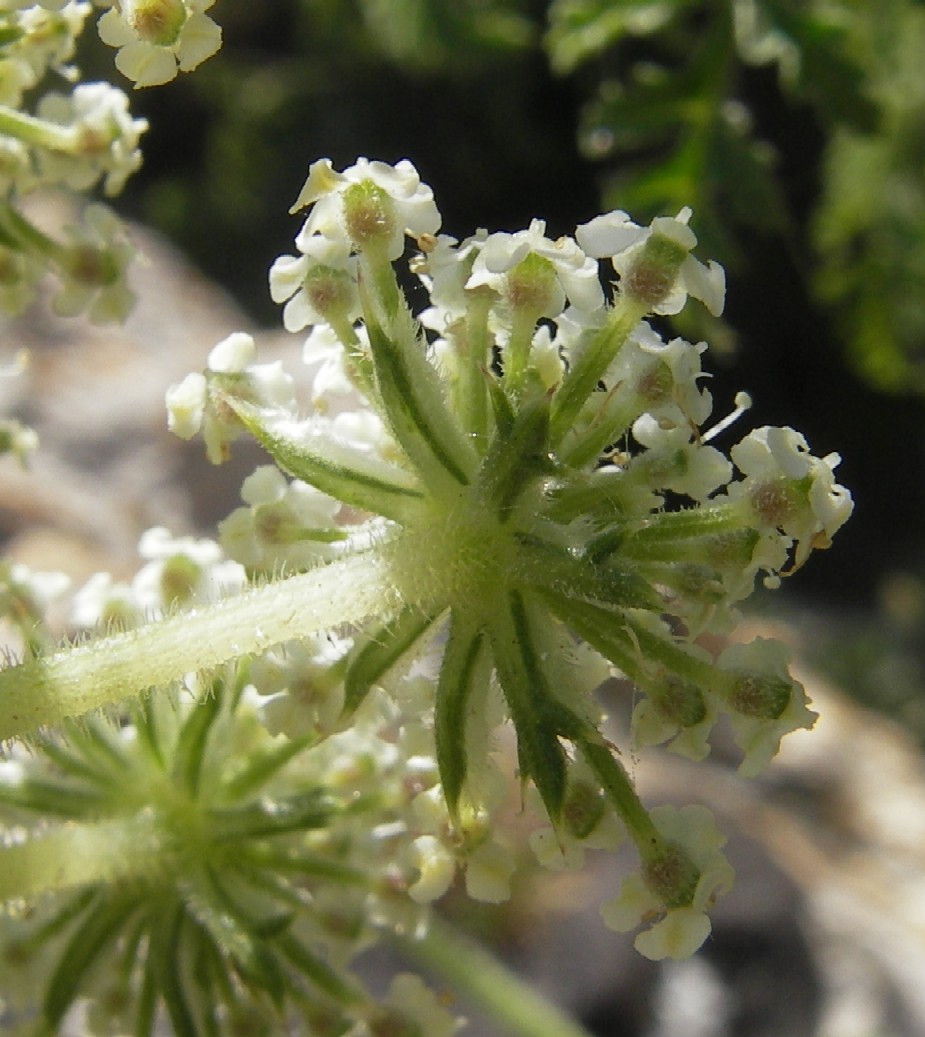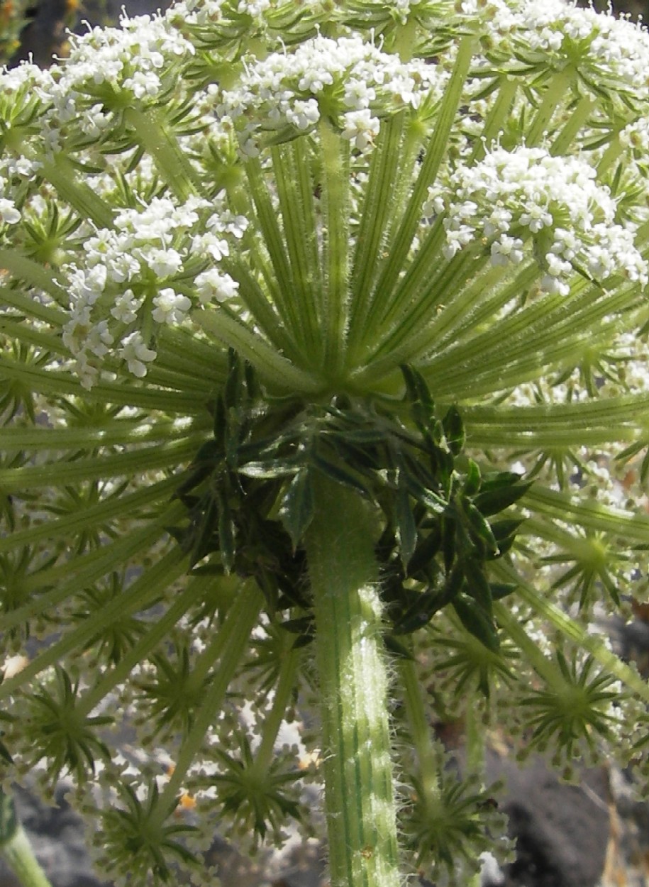 50 Strahlen, Doldenstrahlen rauhaarig, Fruchtdolde +/- ausgebreitet Stacheln der Früchte am Grund verbreitert und zu einem Kamm zusammenlaufend, mit geraden Haaren