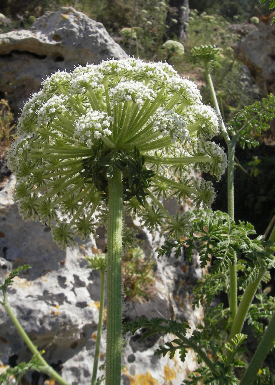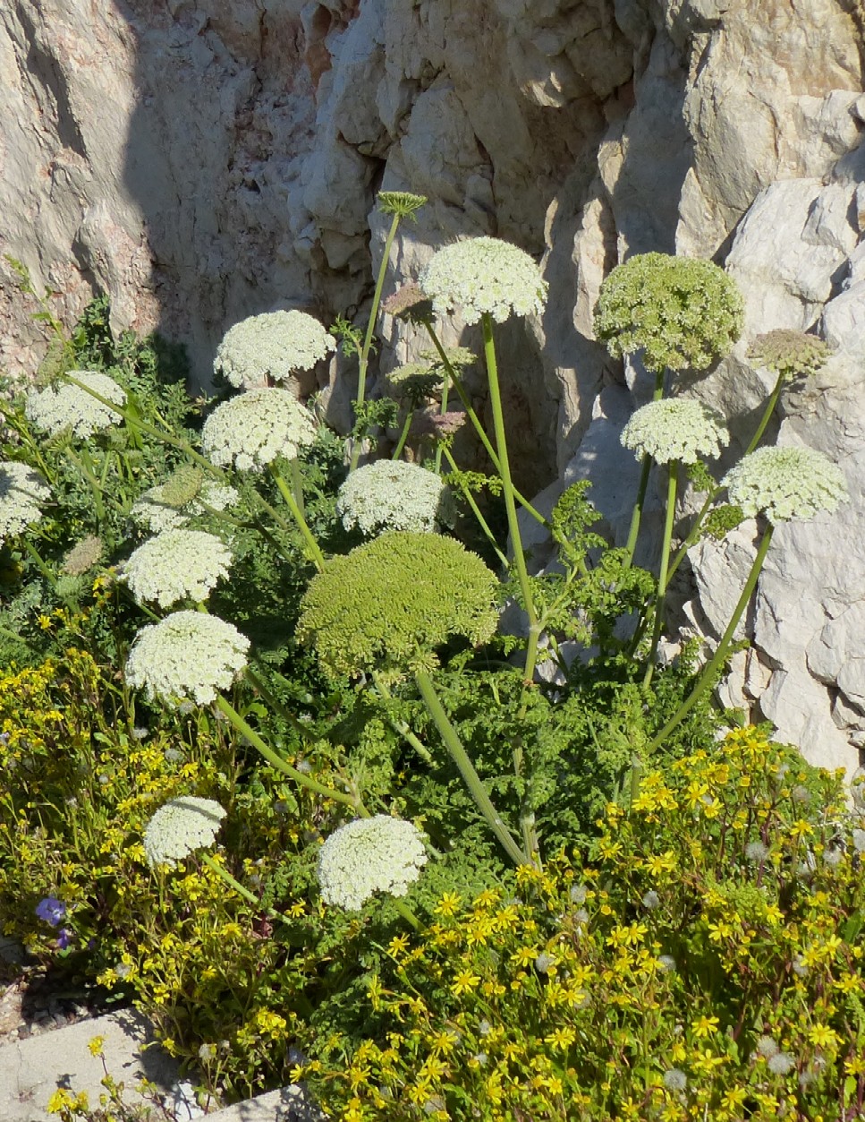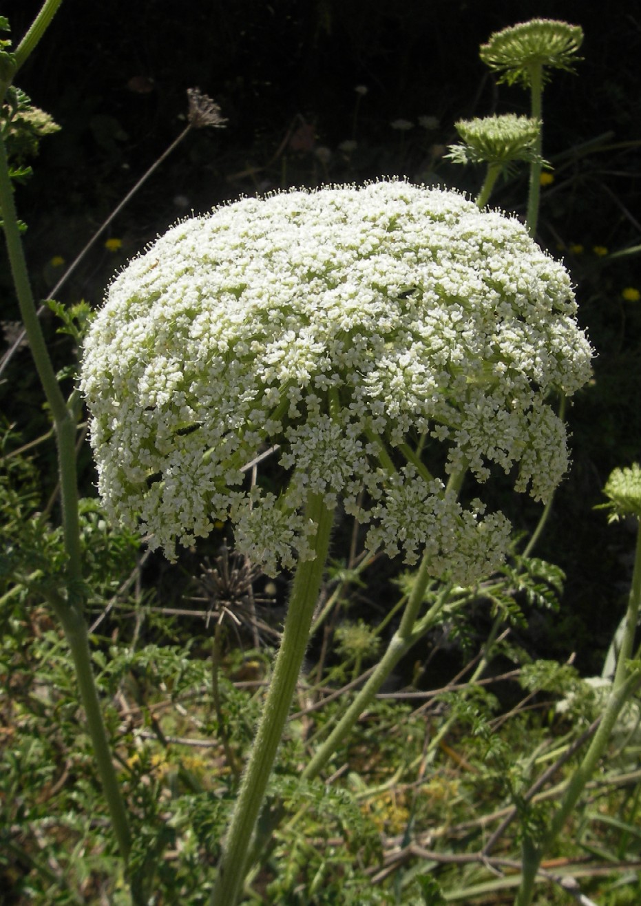 50 Strahlen, Doldenstrahlen rauhaarig, Fruchtdolde +/- ausgebreitet Stacheln der Früchte am Grund verbreitert und zu einem Kamm zusammenlaufend, mit geraden Haaren