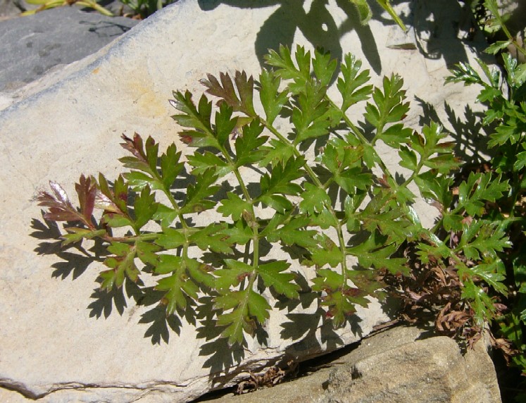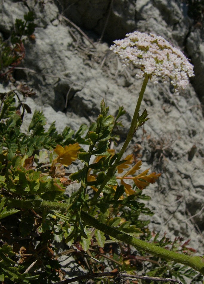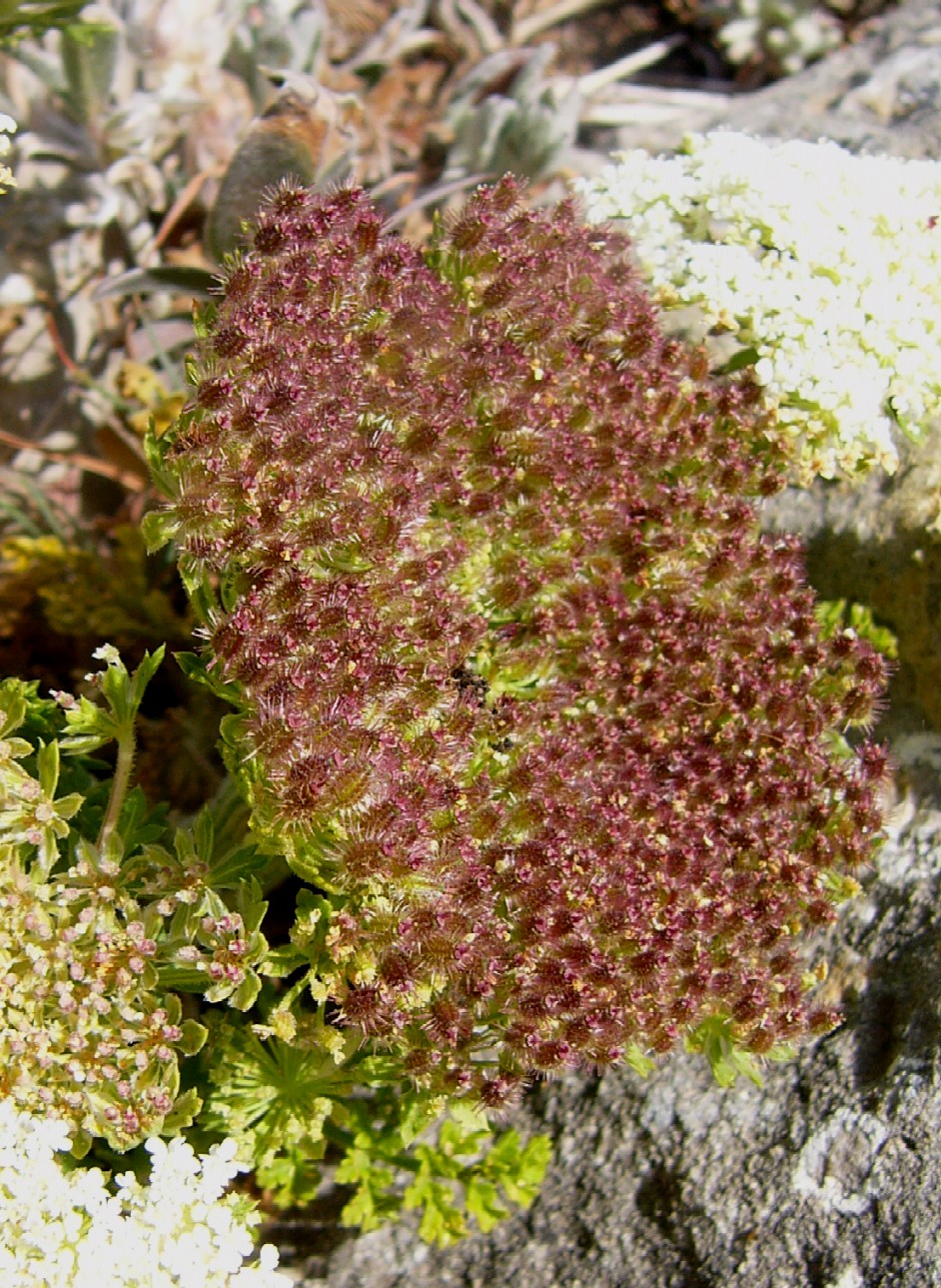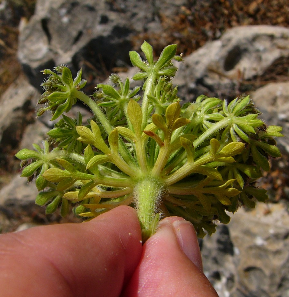 Endemit der Sierra Cantabrica, Spanien Dolden nur 2 - 4 cm im Durchmesser, Hüllblätter mit linealischen Abschnitten Blätter im Umriss länglich, mit linealischen Endfiedern > 5