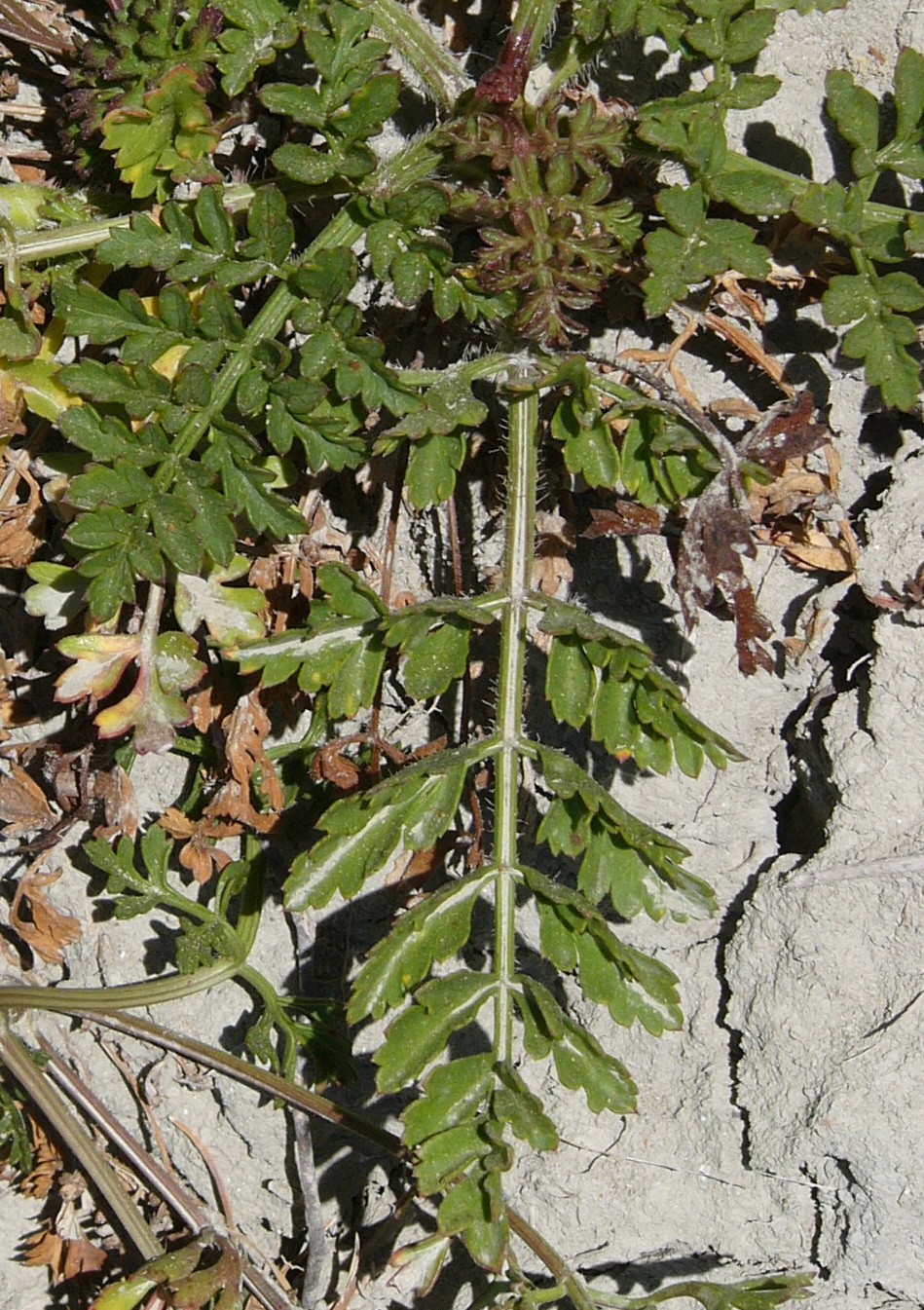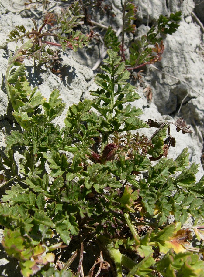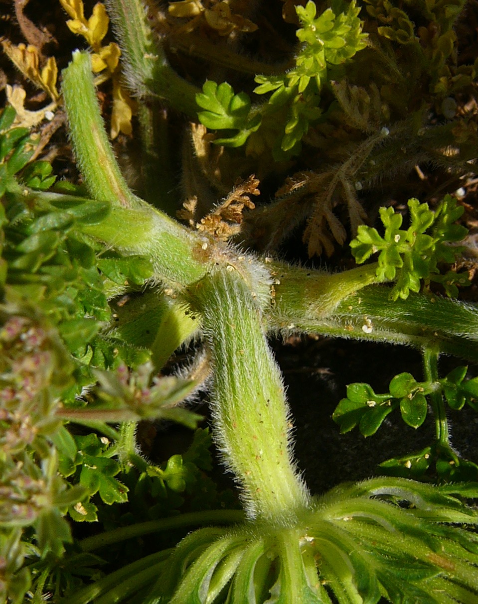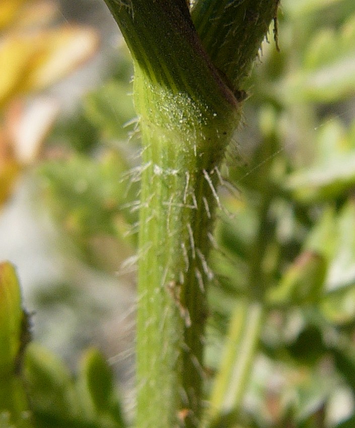 Blätter im Umriss länglich, 3 - 4- fach fiederteilig, Fiederchen linealisch, lang stachelspitzig, oberseits +/- kahl, Blattnerven unterseits und Rhachis mit borstigen Haaren