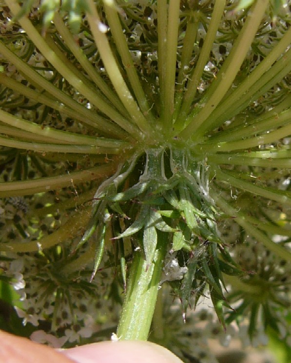 Durchmesser, ausgebreitet oder etwas konkav, Hüllblätter 6 - 8, ungeteilt, 3- spitzig oder fiederteilig, mit linealischen Abschnitten, kahl, viel kürzer wie die Doldenstrahlen, Hüllchenblätter ungeteilt oder seltener 3- spitzig, kahl Fruchtdolde +/- ausgebreitet