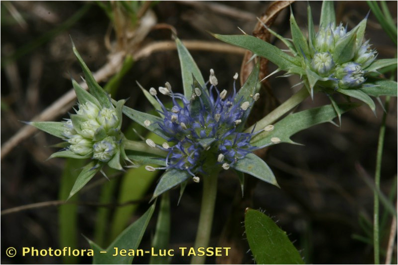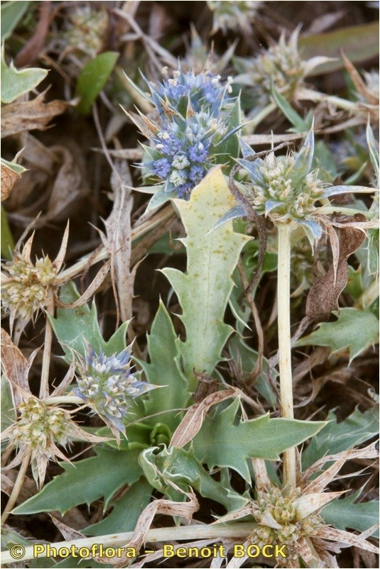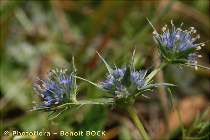 Köpfchen 0,8 - 1 cm im Durchmesser, blaugrün, mit 12 - 25 Hüllblättern, innerhalb mit einigen Tragblättern, Hüll- und Tragblätter lassen sich nicht voneinander unterscheiden, ganzrandig, seltener mit 1 Paar Dornen