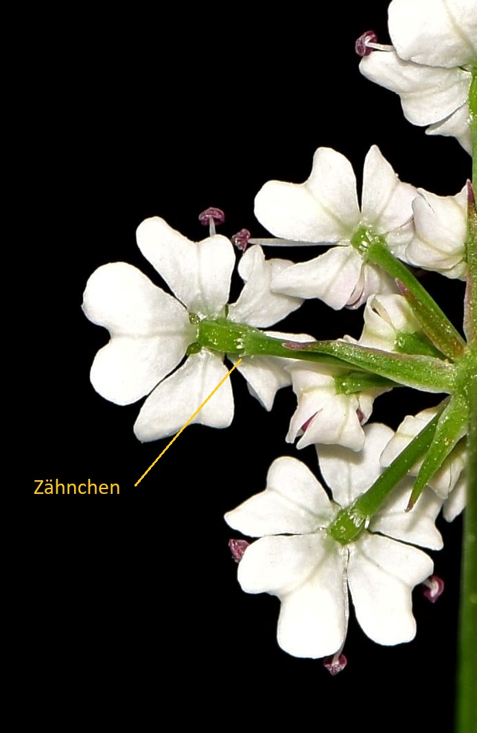 Döldchenstrahlen 2 - 6 mm lang, unterhalb der Blüte meist mit Zähnchen
