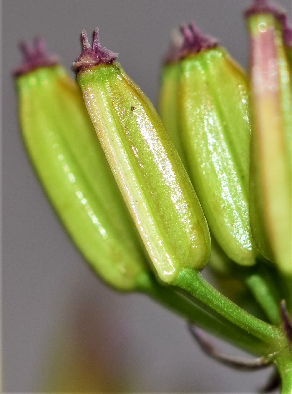 5 Früchte ca. 1,5 mal so lang wie breit, mit undeutlichen Seitenrippen