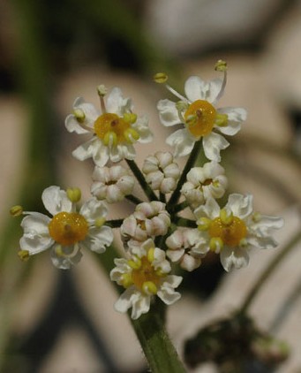 Endemit in SO- Frankreich Blüten weiß, Griffelpolster auffallend gelb Randblüten nur schwach vergrößert > Heracleum pumilum
