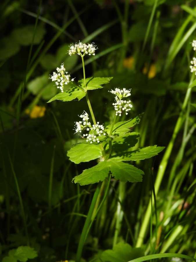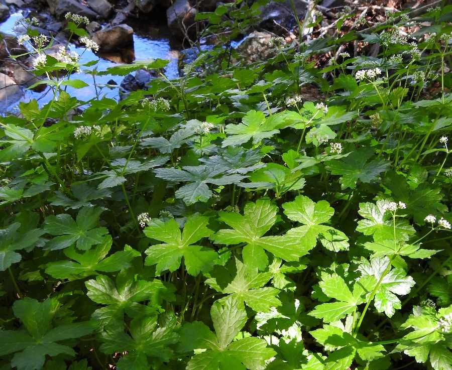 Stängelblätter sitzend, 3 - 5 lappig Grundblätter lang gestielt, Blattspreite 4 - 6 cm im Durchmesser, handförmig 5- teilig, Blattlappen gezähnt