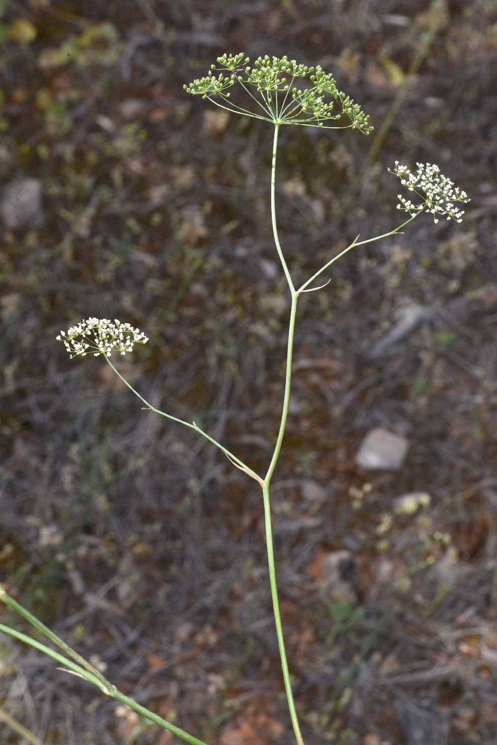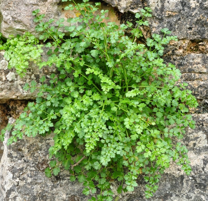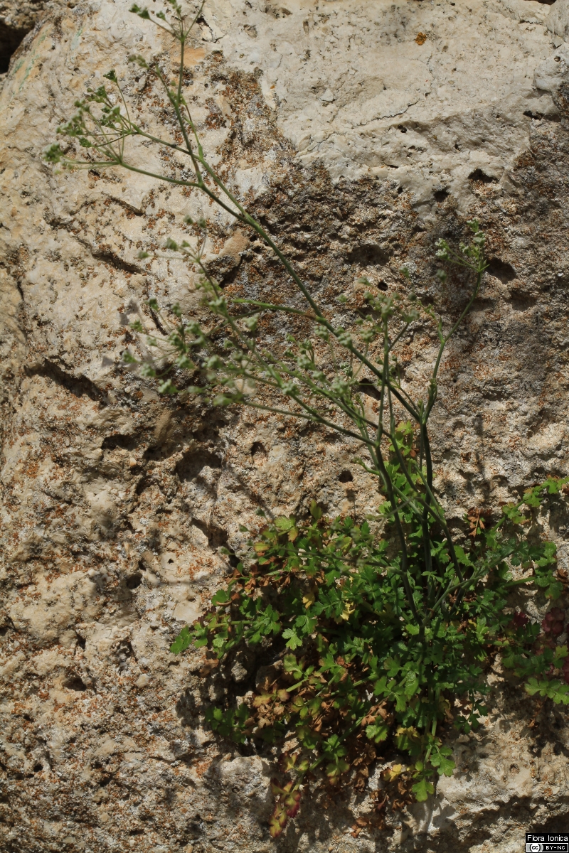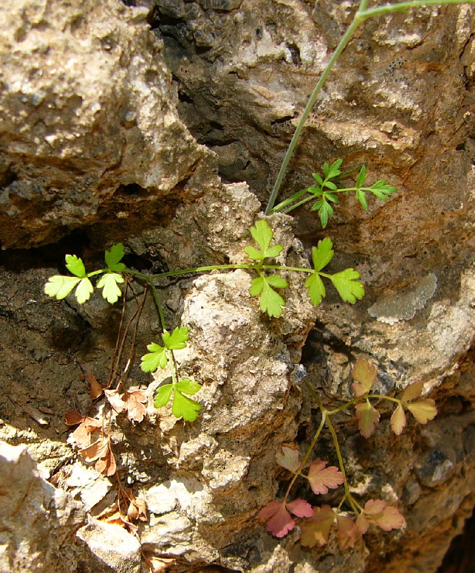 Früchte eiförmig, c. 1,5 mm im Durchmesser, am Grund herzförmig Stängel aufrecht, schlank, gestreift, kahl Grundblätter 2 - 3- fach dreiteilig gefiedert, im