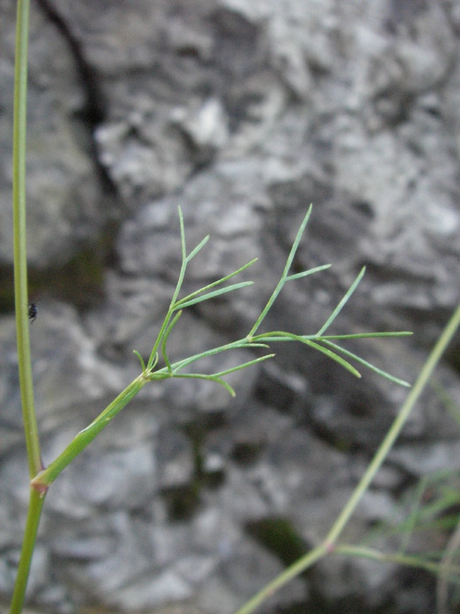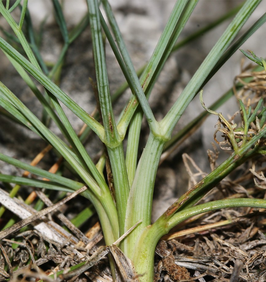 Grundblätter bläulichgrün, 3 - 4- fach gefiedert, 20 - 30 cm lang, Rhachis nicht rinnig