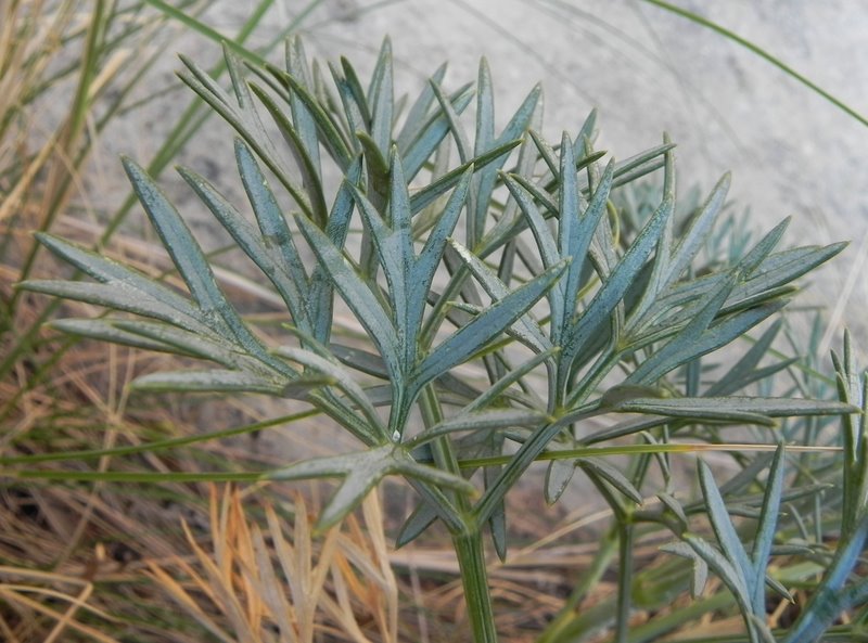 Grundblätter 2 - fach gefiedert, blaugrün, ledrig, mit linealischen, 2 - 5 mm breiten, vorne meist dreiteiligen Fiederabschnitten, Blätter mit einer wachsartigen Schicht überzogen, die ihnen eine ausgeprägte blaugrüne Farbe verleiht, reibt man die Wachsschicht ab sind die Blätter grün