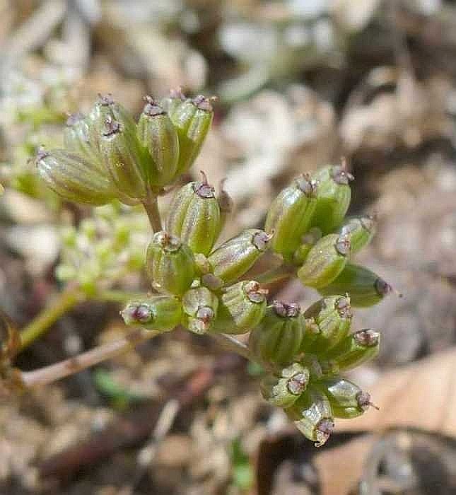 Reife Früchte eirundlich, 6 - 9 mm lang, schwach zusammengedrückt, deutlich gerippt, Griffelpolster konisch, Griffel ca. 1 mm lang, zurückgebogen, Kelchzähne undeutlich oder fehlend