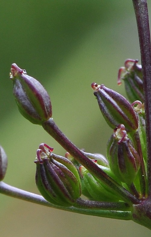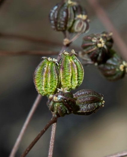 Früchte runzlig, mit deutlichen Rippen Stängelblätter 2 - 3 fach gefiedert, mit schmal linealischen, blaugrünen Fiederabschnitten