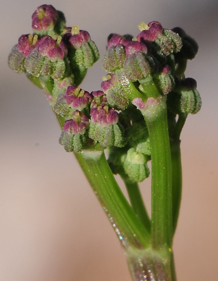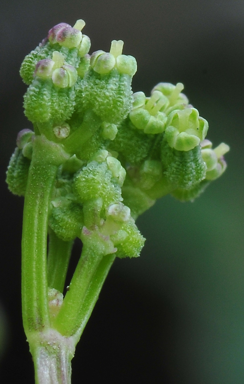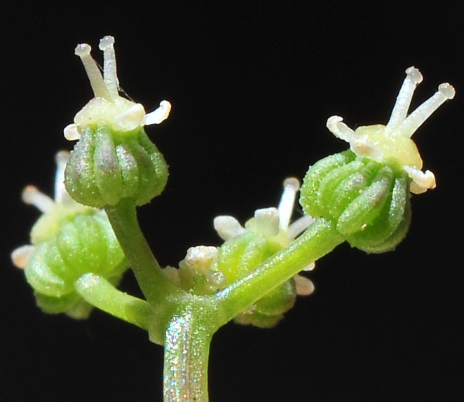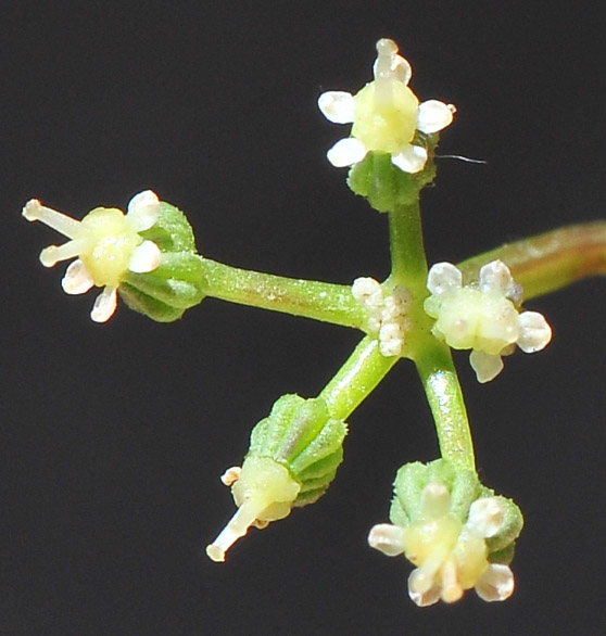 gelblich Döldchen der weiblichen Blüten mit 4 - 8 Blüten, Kronblätter weiß oder grünlich, außen oft rot überlaufen, nach innen gerollt, mit grünlich- gelbem Griffelpolster und 2 Griffel, Staubblätter fehlend oder reduziert Zwischen den weiblichen befinden sich öfter auch zwittrige Blüten mit 5 Staubblättern