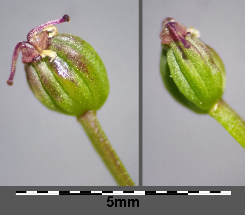 Griffelpolster mit 2 zunächst aufrechten, später zurückgebogenen Griffeln, Staubblätter fehlend Früchte eiförmig, 2,5 - 4,2 mm lang,