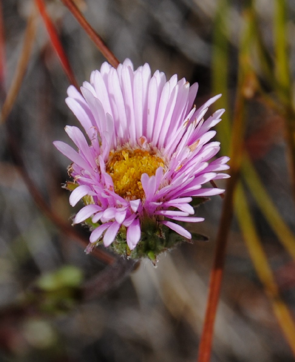 Köpfchen 12 - 22 mm im Durchmesser, zwischen Röhren- und Zungenblüten befinden sich Fadenblüten, Zungenblüten in 2 - 3 Reihen, 4 - 8 mm lang, lila, Röhrenblüten gelblich, an der Spitze oft purpurn