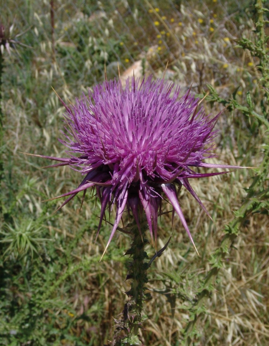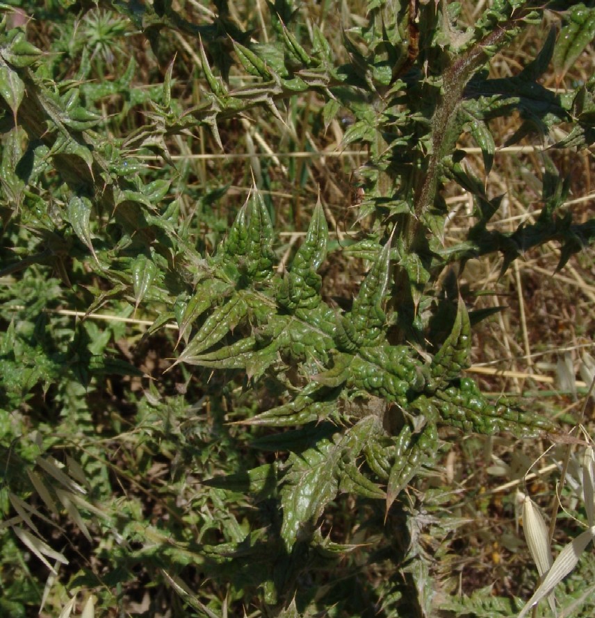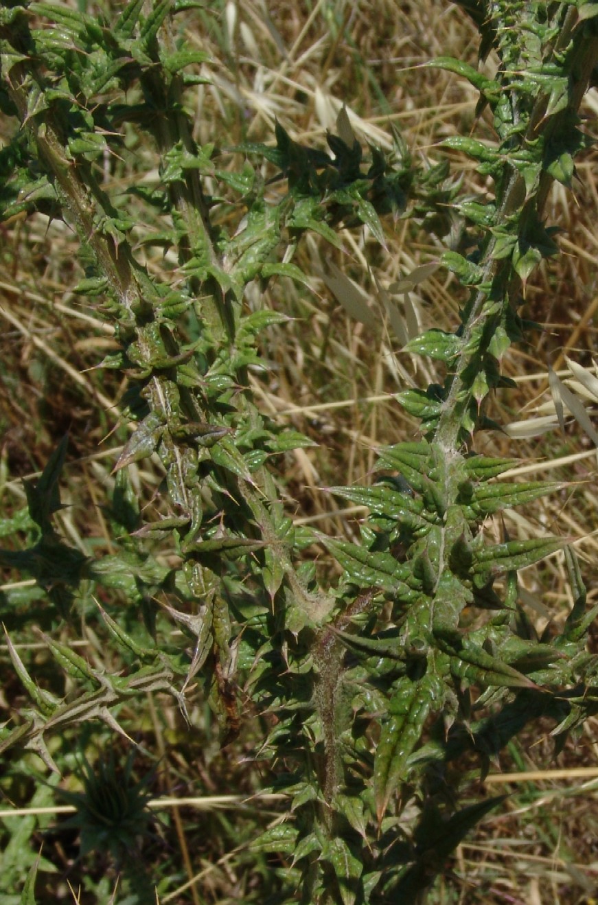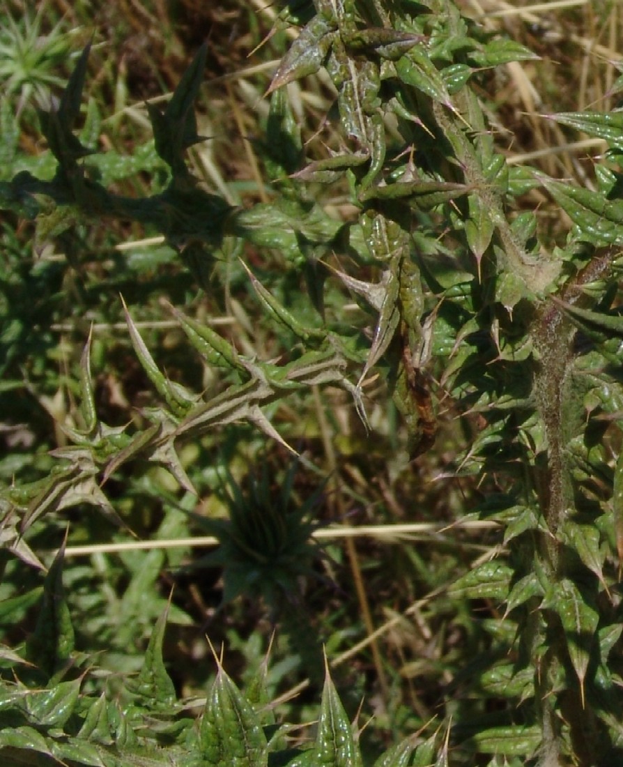 Stängelblätter zahlreich, auf der Oberseite grün, fiederteilig, mit langen Dornen