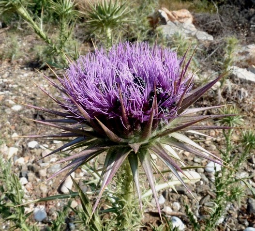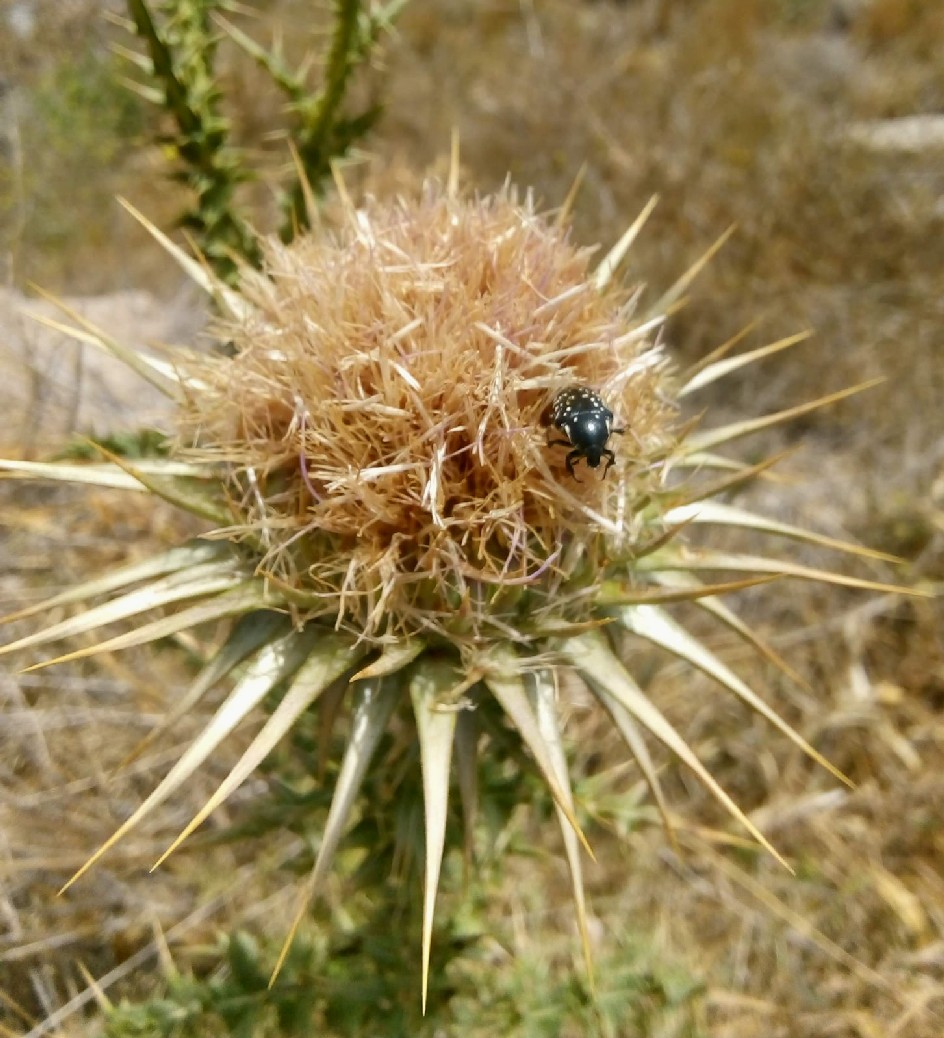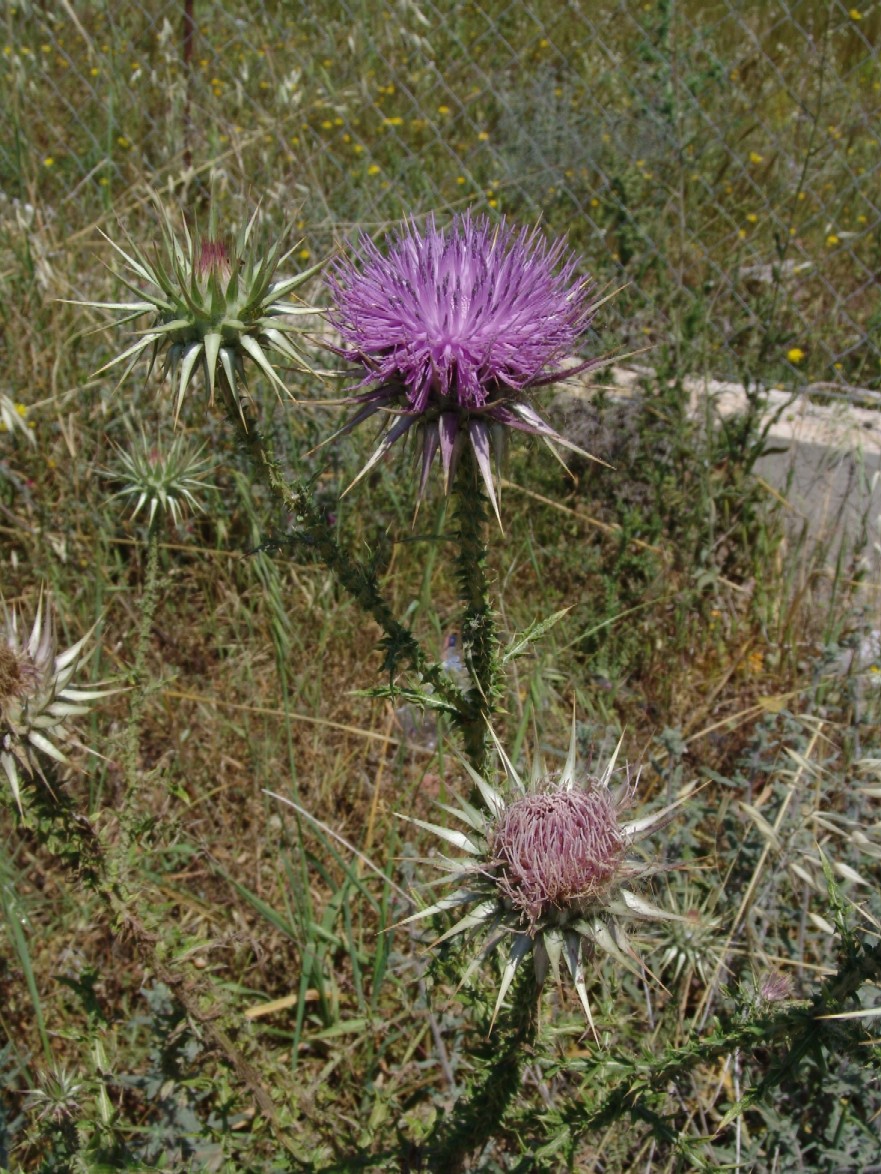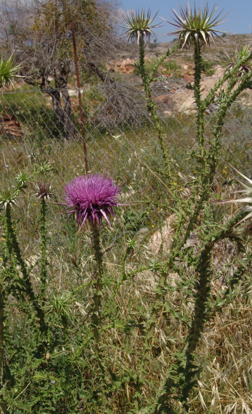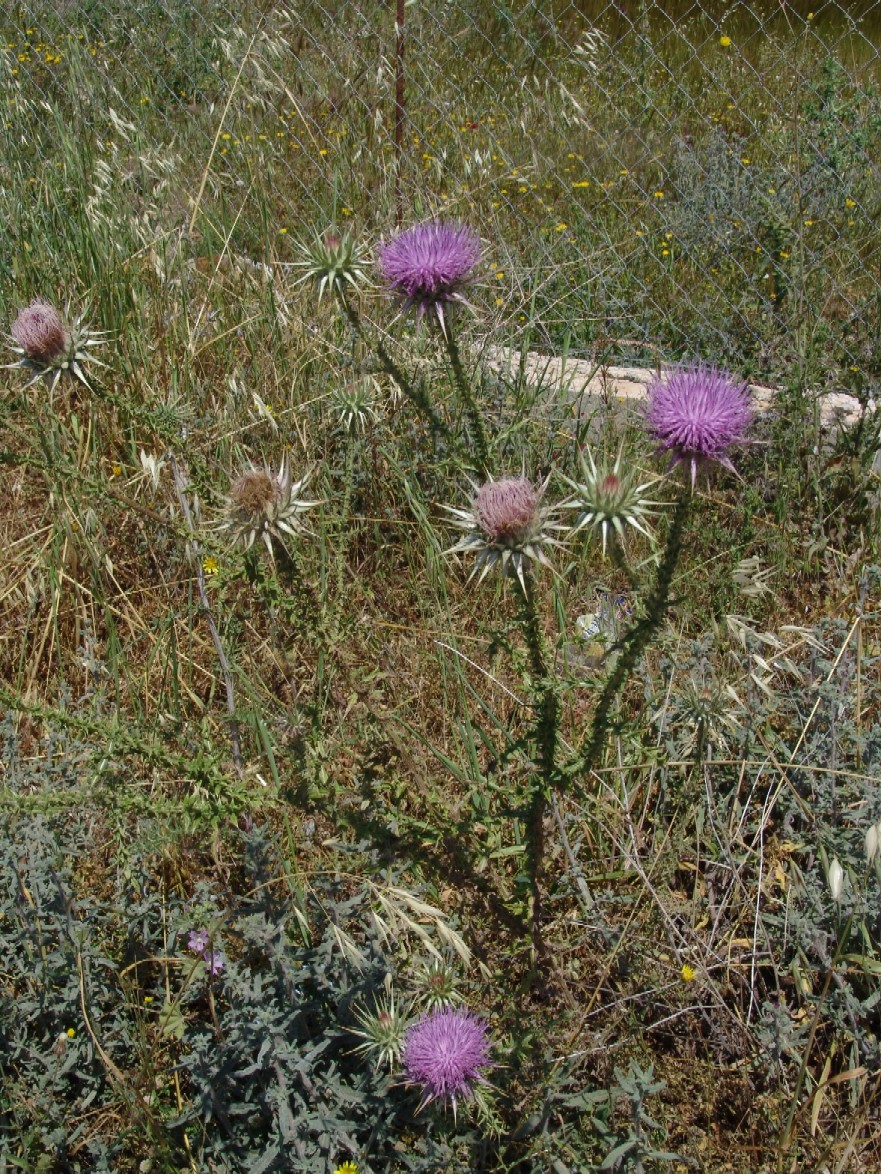 Stängelblätter zahlreich, auf der Oberseite grün, fiederteilig, mit langen Dornen