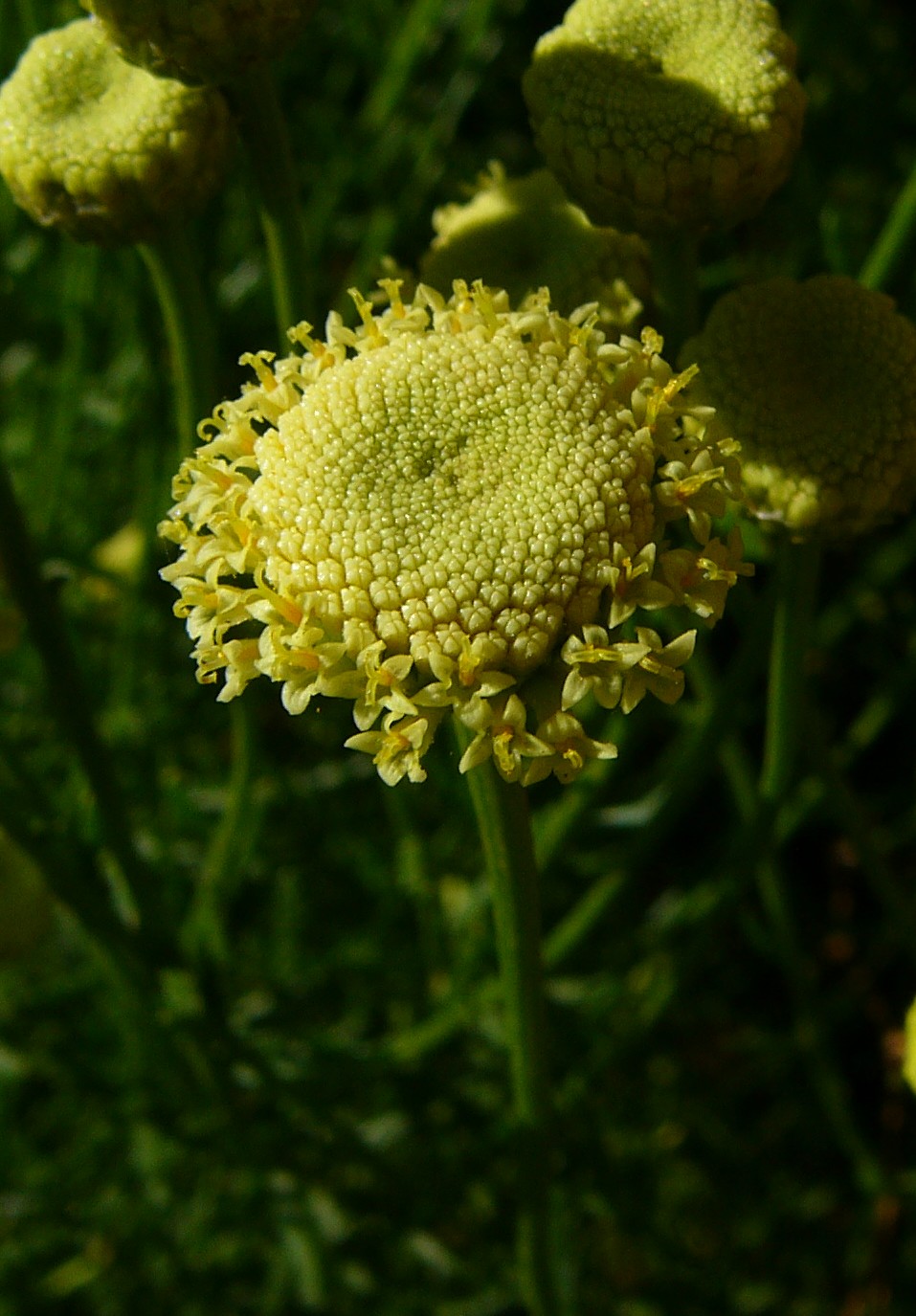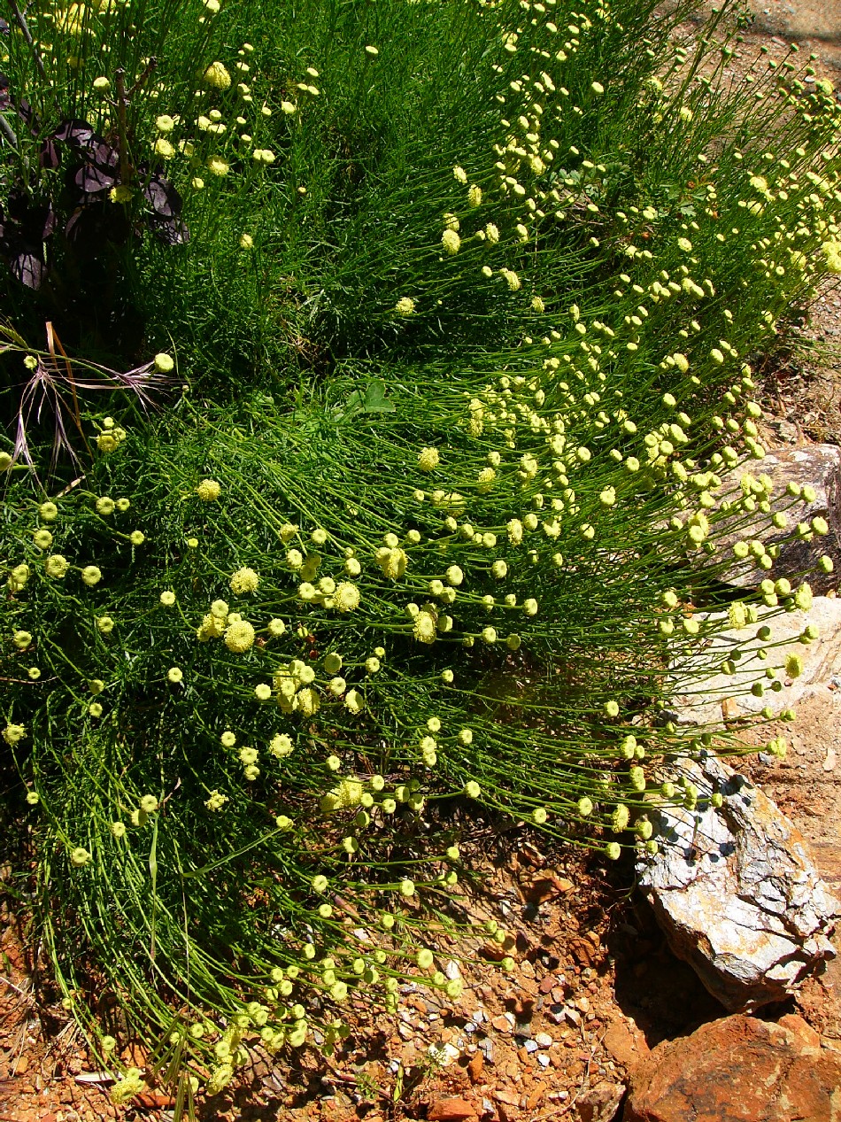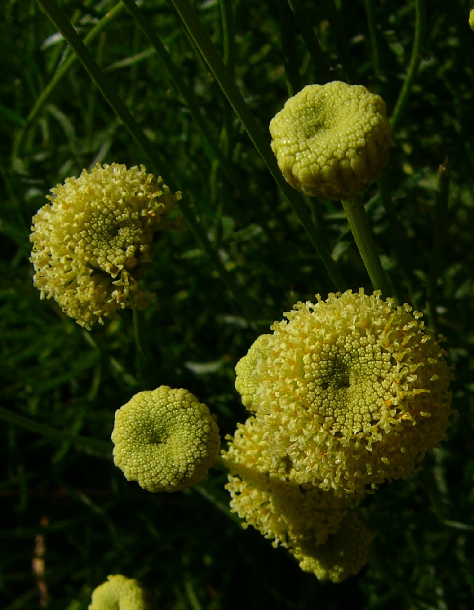 VI - VIII, Flussufer, Macchien, Gewürzpflanze (500 - 800 m) Synonyme: English name: Nom francais: Nome italiano: Weltweite Verbreitung: Eingebürgert in: Wird als Zierpflanze kultiviert. Die Wildpflanzen aus Nordspanien haben gelbe Blüten. Deswegen sind die hier gezeigten Pflanze aus dem Botanischen Garten Kreta wahrscheinlich eine Sorte. Einige Anbieter bezeichnen diese Sippe als Santolina viridis, andere als Santolina rosmarinifolia! Grünes Heiligenkraut riecht nach Oliven und wird auch zur Würzung eingelegter Oliven genutzt ("Olivenkraut"). Schöne Bilder und Hinweise zur Verwendung von Santolina virens finden Sie auf der Seite von Jennifer Markwirth "Flora Obscura"