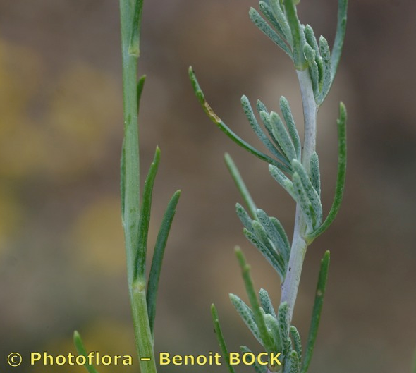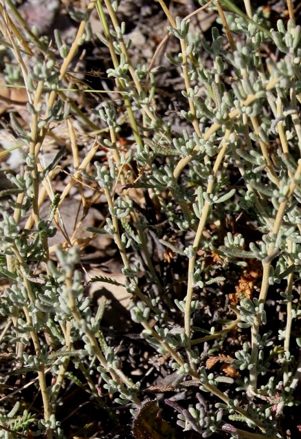 verkahlend, Sterile Sprosse mit 5 - 10 büscheligen Blättern, die in den Achseln wesentlich längerer Tragblätter stehen, Blätter der nichtblühenden Sprosse linealisch, 5 - 12 mm lang, 1 mm breit, warzig oder schuppig, sitzend oder kurz gestielt, Tragblätter der sterilen Sprosse 8 - 17 mm lang, meist fiederteilig